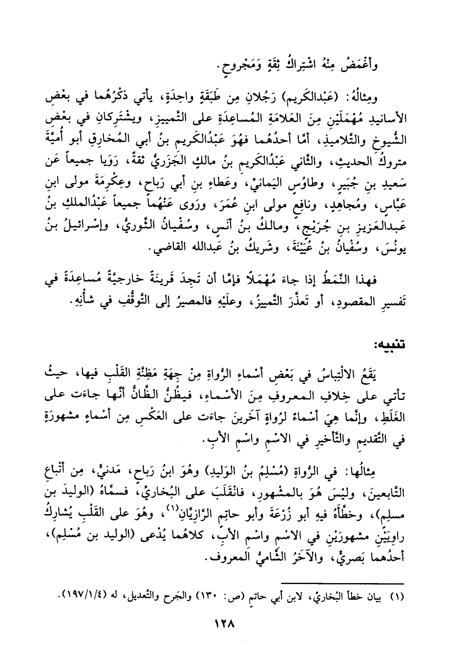 مثالها: في الرواة (مسلم بن الوليد) وهو ابن رباح، مدني، من أتباع التابعين، وليس هو بالمشهور، فانقلب على البخاري، فسماه (الوليد بن مسلم)، وخطأه فيه أبو زرعة وأبو حاتم الرويان (¬1)، وهو على القلب يشارك راويين مشهورين في الاسم واسم الأب، كلاهم يدعى (الوليد بن مسلم)، أحدهما بصري، والآخر الشامي المعروف.
