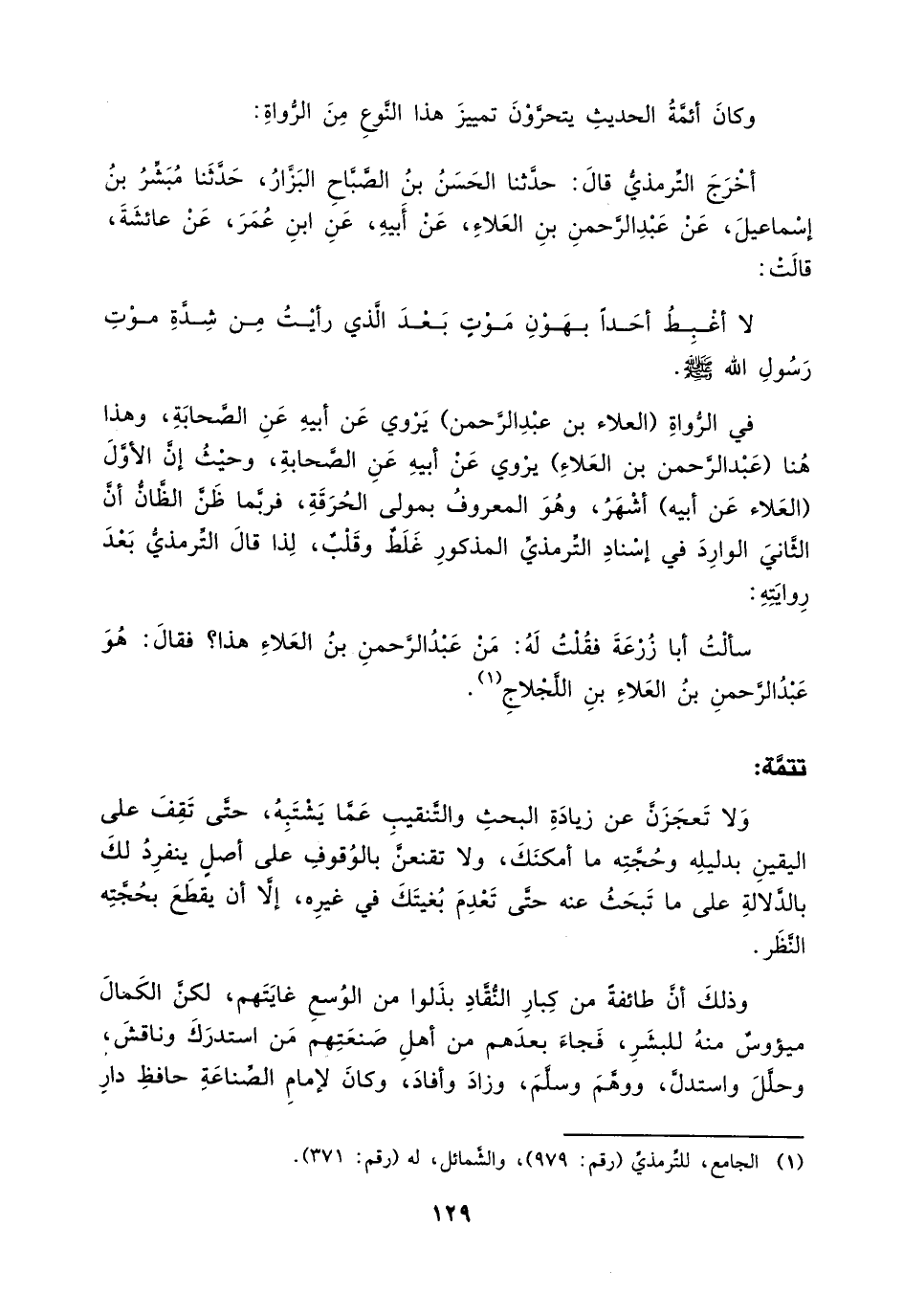 أخرج الترمذي قال: حدثنا الحسن بن الصباح البزار، حدثنا مبشر بن إسماعيل، عن عبد الرحمن بن العلاء، عن أبيه، عن ابن عمر، عن عائشة، قالت: