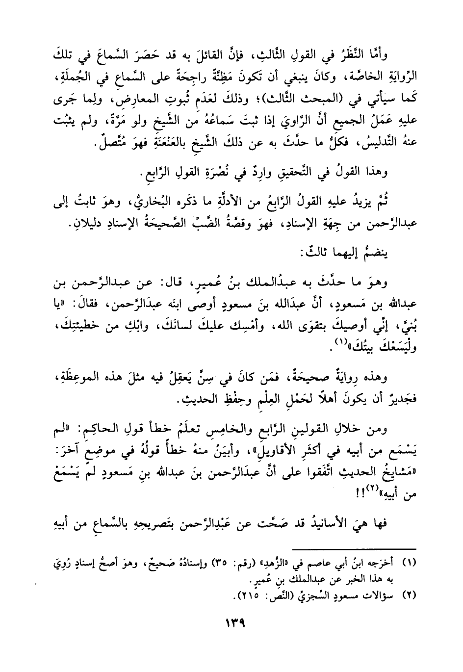ومن خلال القولين الرابع والخامس تعلم خطأ قول الحاكم: " لم يسمع من أبيه في أكثر الأقاويل "، وأبين منه خطأ قوله في موضع آخر: " مشايخ الحديث اتفقوا على أن عبد الرحمن بن عبد الله بن مسعود لم يسمع من أبيه " (¬2)!!