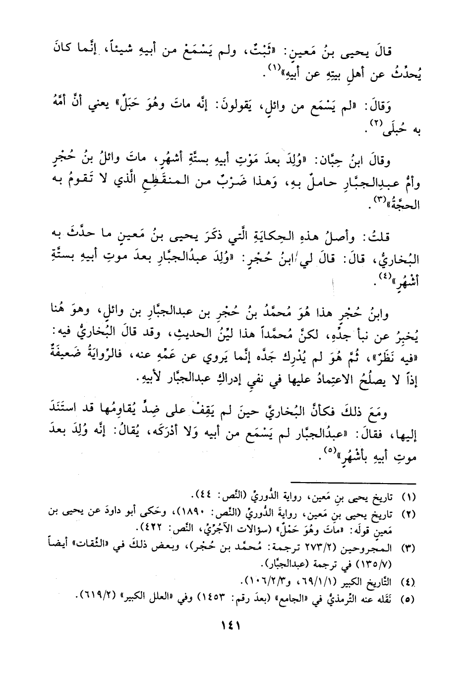 ومع ذلك فكأن البخاري حين لم يقف على ضده يقاومها قد استند إليها، فقال: " عبد الجبار لم يسمع من أبيه ولا أدركه، يقال: إنه ولد بعد موت أبيه بأشهر " (¬5).