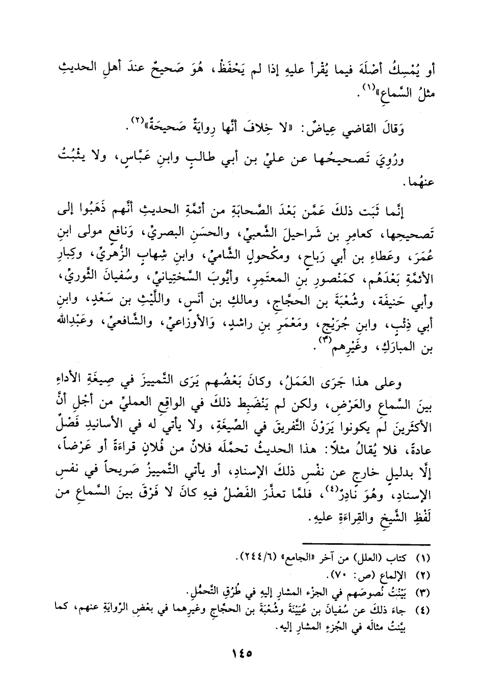 وعلى هذا جرى العمل، وكان بعضهم يرى التمييز في صيغة الأداء بين السماع والعرض، ولكن لم ينضبط ذلك في الواقع العملي من أجل أن الأكثرين لم يكونوا يرون التفريق في الصيغة، ولا يأتي له في الأسانيد فصل عادة، فلا يقال مثلاً: هذا الحديث تحمله فلان من فلان قراءة أو عرضاً، إلا بدليل خارج عن نفس ذلك الإسناد، أو يأتي التمييز صريحاً في نفس الإسناد، وهو نادر (¬4)، فلما تعذر الفصل فيه كان لا فرق بين السماع من لفظ الشيخ والقراءة عليه.