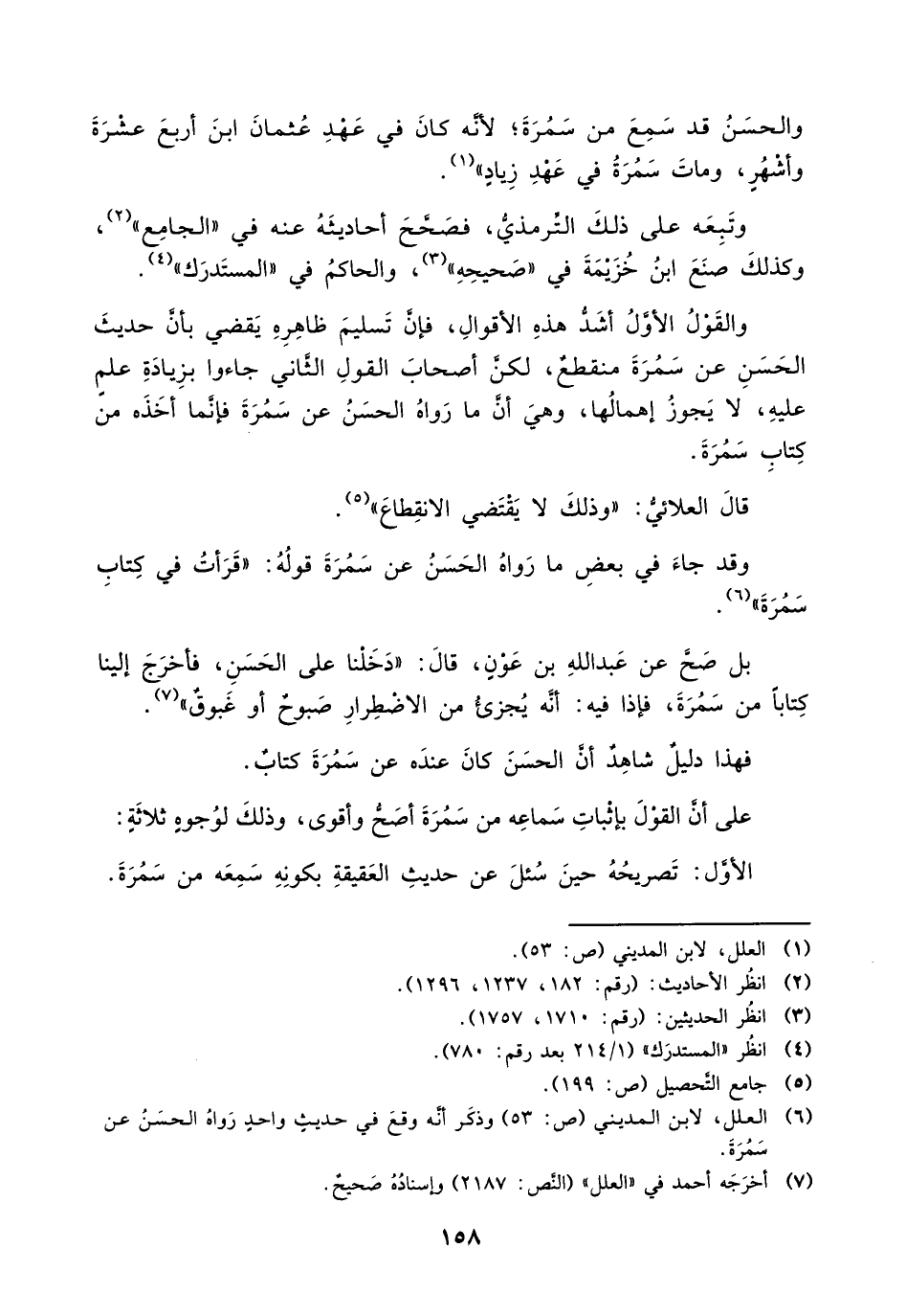 والقول الأول أشد هذه الأقوال، فإن تسليم ظاهره يقضي بأن حديث الحسن عن سمرة منقطع، لكن أصحاب القول الثاني جاءوا بزيادة علم عليه، لا يجوز إهمالها، وهي أن ما رواه الحسن عن سمرة فإنما أخذه من كتاب سمرة.