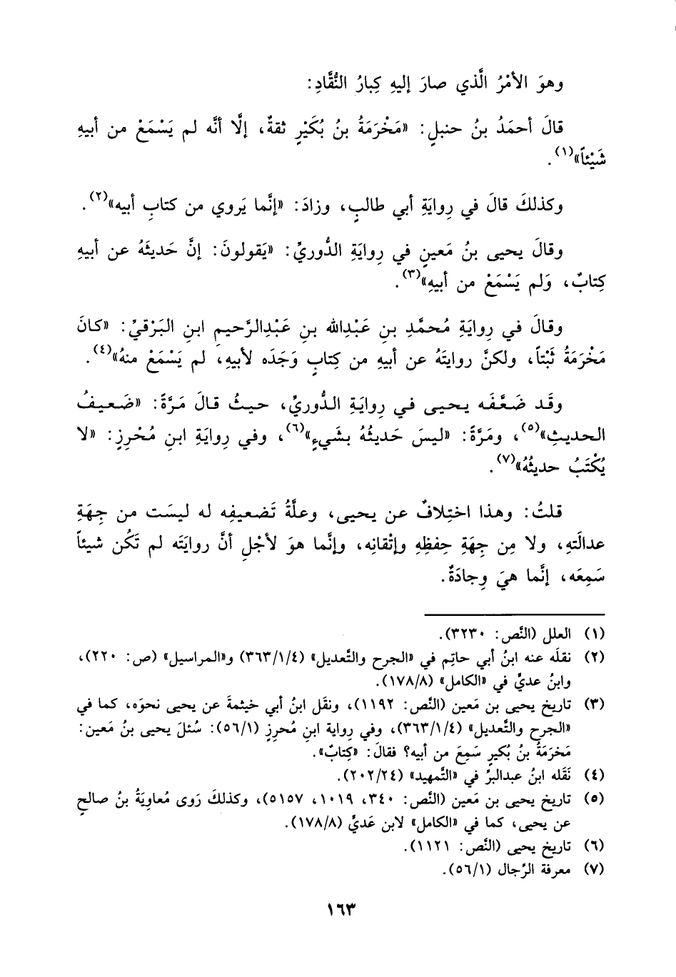 (¬3) تاريخ يحيى بن معين (النص: 1192)، ونقل ابنُ أبي خيثمة عن يحيى نحوه، كما في " الجرح والتعديل " (4/ 1 / 363)، وفي رواية ابن مُحرز (1/ 56): سُئل يحيى بن معين: مخرمة بن بُكير سمع من أبيه؟ فقال: " كتاب ".