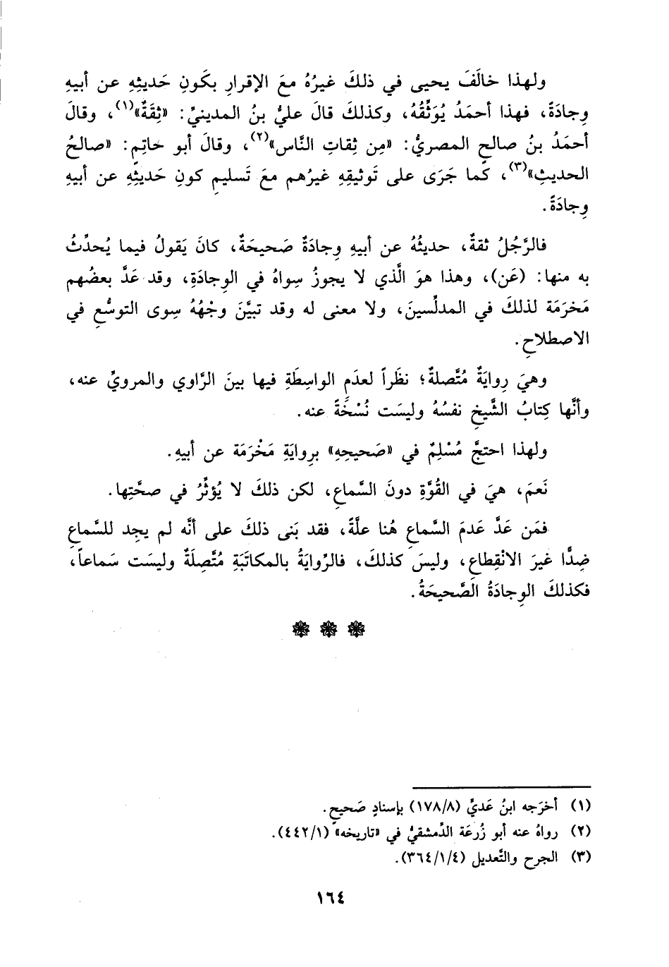 ولهذا خالف يحيى في ذلك غيره مع الإقرار بكون حديثه عن أبيه وجادة، فهذا أحمد يوثقه، وكذلك قال علي بن المديني: " ثقة " (¬1)، وقال أحمد بن صالح المصري: " من ثقات الناس " (¬2)، وقال أو حاتم: " صالح الحديث " (¬3)، كما جرى على توثيقه غيرهم مع تسليم كون حديثه عن أبيه وجادة.