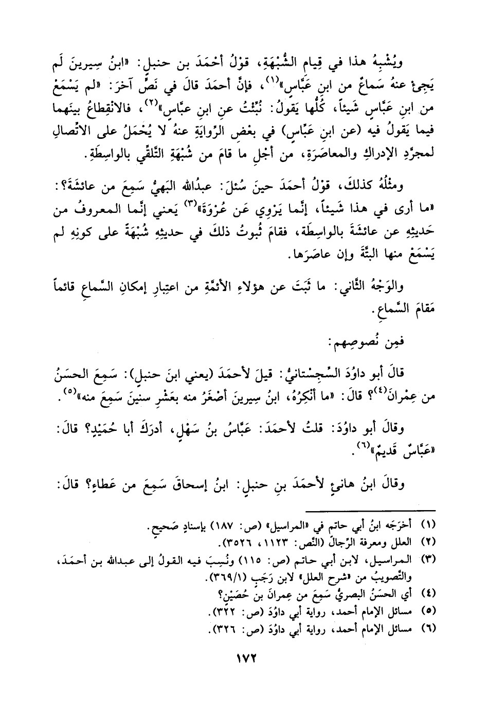 ويشبه هذا في قيام الشبهة، قول أحمد بن حنبل: " ابن سيرين لم يجئ عنه سماع من ابن عباس " (¬1)، فإن أحمد قال في نص آخر: " لم يسمع من ابن عباس شيئاً، كلها يقول: نبئت عن ابن عباس " (¬2)، فالانقطاع بينهما فيما يقول فيه (عن ابن عباس) في بعض الرواية عنه لا يحمل على الاتصال لمجرد الإدراك والمعاصرة، من أجل ما قام من شبهة التلقي بالواسطة.