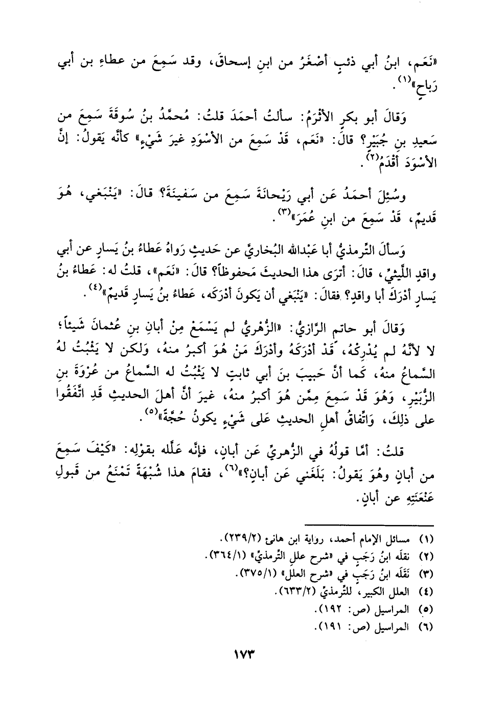 وقال أبو حاتم الرازي: " الزهري لم يسمع من أبان بن عثمان شيئاً؛ لا لأنه لم يدركه، قد أدركه وأدرك من هو أكبر منه، ولكن لا يثبت له السماع منه، كما أن حبيب بن أبي ثابت لا يثبت له السماع من عروة بن الزبير، وهو قد سمع ممن هو أكبر منه، غير أن أهل الحديث قد اتفقوا على ذلك، واتفاق أهل الحديث على شيء يكون حجة " (¬5).