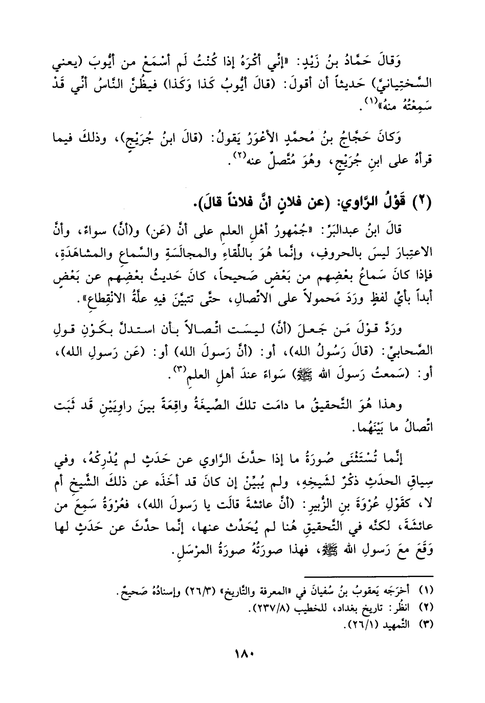 ورد قول من جعل (أن) ليست اتصالاً بأن استدل بكون قول الصحابي: (قال رسول الله)، أو: (أن رسول الله) أو: (عن رسول الله)، أو: (سمعت رسول الله صلى الله عليه وسلم) سواء عند أهل العلم (¬3).