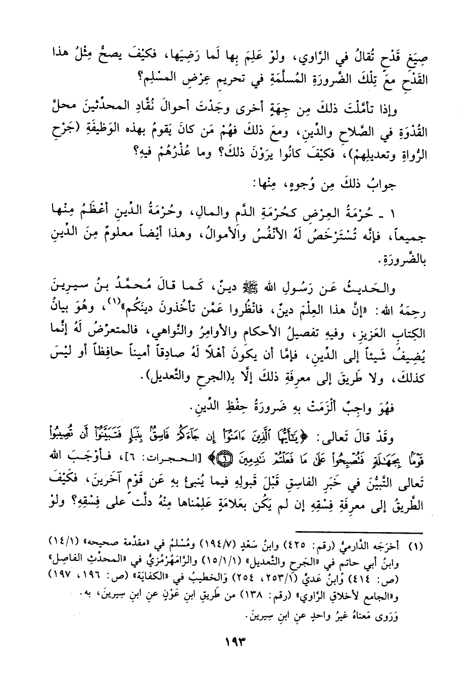 وإذا تأملت ذلك من جهة أخرى وجدت أحوال نقاد المحدثين محل القدوة في الصلاح والدين، ومع ذلك فهم من كان يقوم بهذه الوظيفة (جرح الرواة وتعديلهم)، فكيف كانوا يرون ذلك؟ وما عذرهم فيه؟