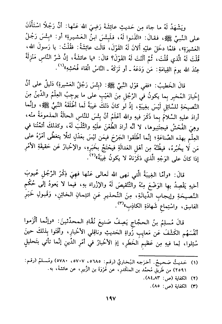 قال الخطيب: " ففي قول النبي صلى الله عليه وسلم: " بئس رجل العشيرة " دليل على أن إخبار المخبر بما يكون في الرجل من العيب على ما يوجب العلم والدين من النصيحة للسائل ليس بغيية، إذا لو كان ذلك غيبة لما أطلقه النبي صلى الله عليه وسلم، وإنما أراد عليه السلام بما ذكر فيه والله أعلم أن بئس للناس الحالة المذمومة منه، وهي الفحش فيجتنبوها، لا أنه أراد الطعن عليه والثلب له، وكذلك أئمتنا في العلم بهذه الصناعة؛ إنما أطلقوا الجرح فيمن ليس بعدل لئلا يتغطى أمره على من لا يخبره، فيظنه من أهل العدالة فيحتج بخبره، والإخبار عن حقيقة الأمر إذا كان على الوجه الذي ذكرناه لا يكون غيبة " (¬2).
