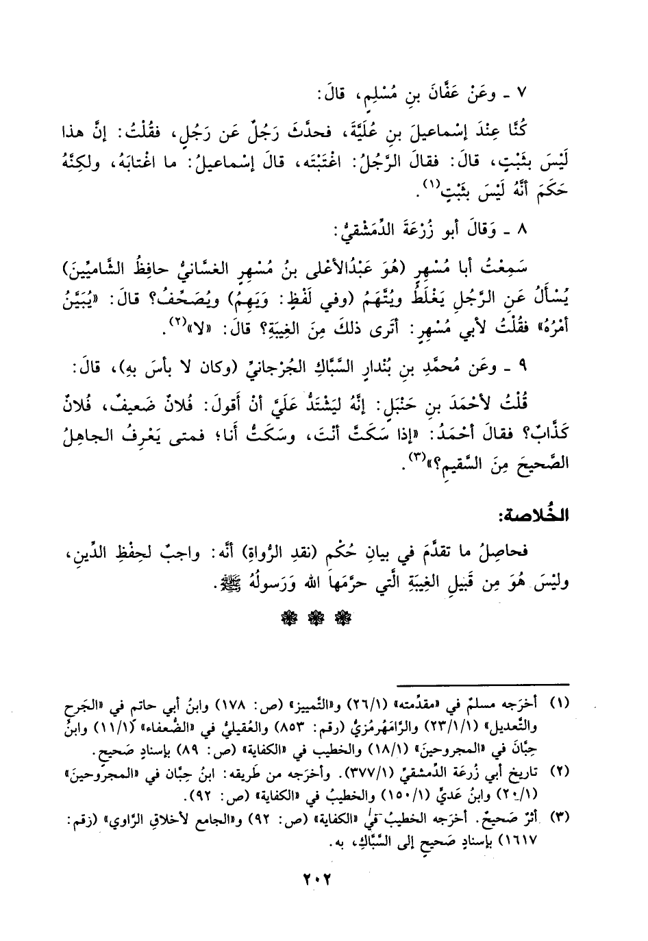 سمعت أبا مسهر (هو عبد الأعلى بن مسهر الغساني حافظ الشاميين) يسأل عن الرجل يغلط ويتهم (وفي لفظ: ويهم) ويصحف؟ قال: " يبين أمره " فقلت لأبي مسهر: أترى ذلك من الغيبة؟ قال: " لا " (¬2).