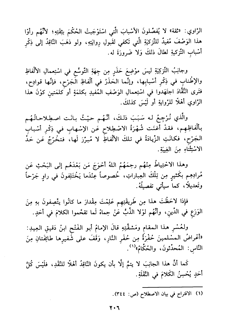 وجانب التزكية ليس موضع حذر من جهة التوسع في استعمال الألفاظ والإطناب في ذكر أسبابها، وإنما الحذر في ألفاظ الجرح، فإنها قوادح، فترى النقاد اجتهدوا في استعمال الوصف المفيد بكلمة أو كلمتين كون هذا الراوي أهلاً للرواية أو ليس كذلك.