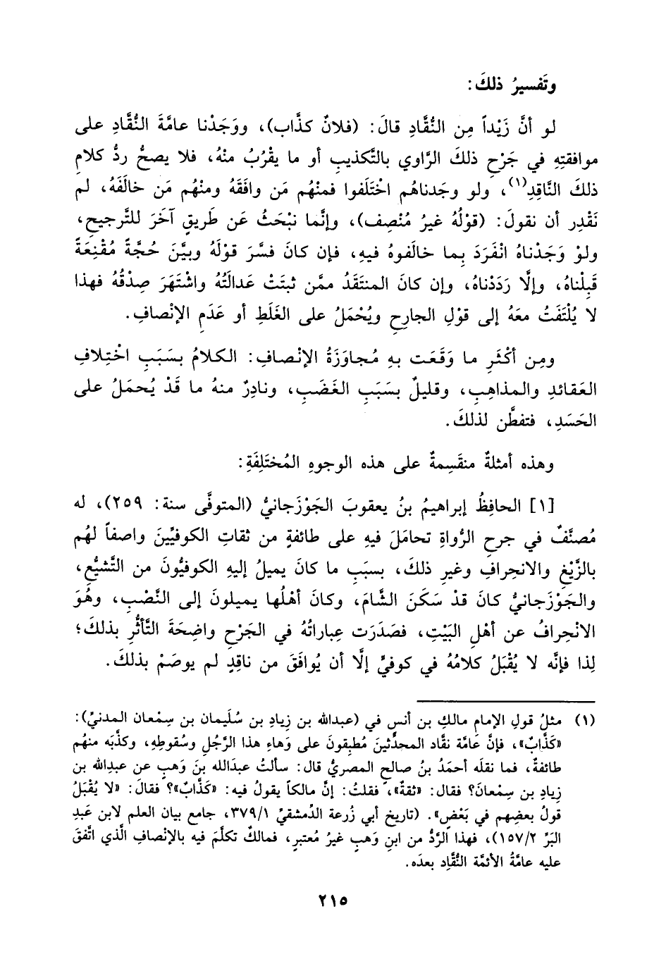 لو أن زيداً من النقاد قال: (فلان كذاب)، ووجدنا عامة النقاد على موافقته في جرح ذلك الراوي بالتكذيب أو ما يقرب منه، فلا يصح رد كلام ذلك الناقد (¬1)، ولو وجدناهم اختلفوا فمنهم من وافقه ومنهم من خالفه، لم نقدر أن نقول: (قوله غير منصف)، وإنما نبحث عن طريق آخر للترجيح، ولو وجدناه انفرد بما خالفوه فيه، فإن كان فسر قوله وبين حجة مقنعة قبلناه، وإلا رددنا، وإن كان المنتقد ممن ثبت عدالته واشتهر صدقه فهذا لا يلتفت معه إلى قول الجارح ويحمل على الغلط أو عدم الإنصاف.