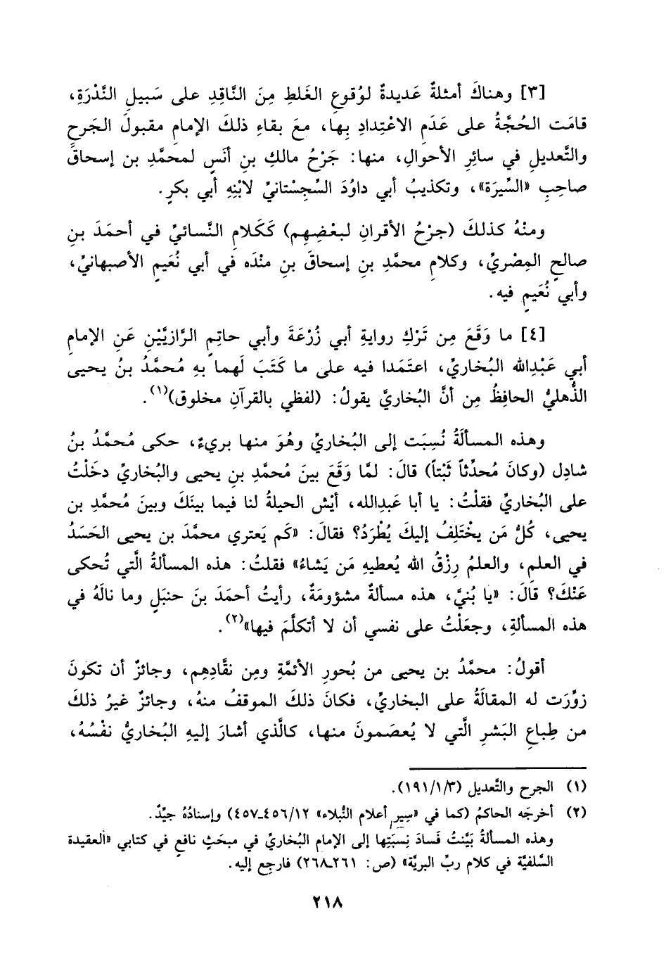 [4] ما وقع من ترك رواية أبي زرعة وأبي حاتم الرازيين عن الإمام أبي عبد الله البخاري، اعتمدا فيه على ما كتب لهما به محمد بن يحيى الذهلي الحافظ من أن البخاري يقول: (لفظي بالقرآن مخلوق) (¬1).