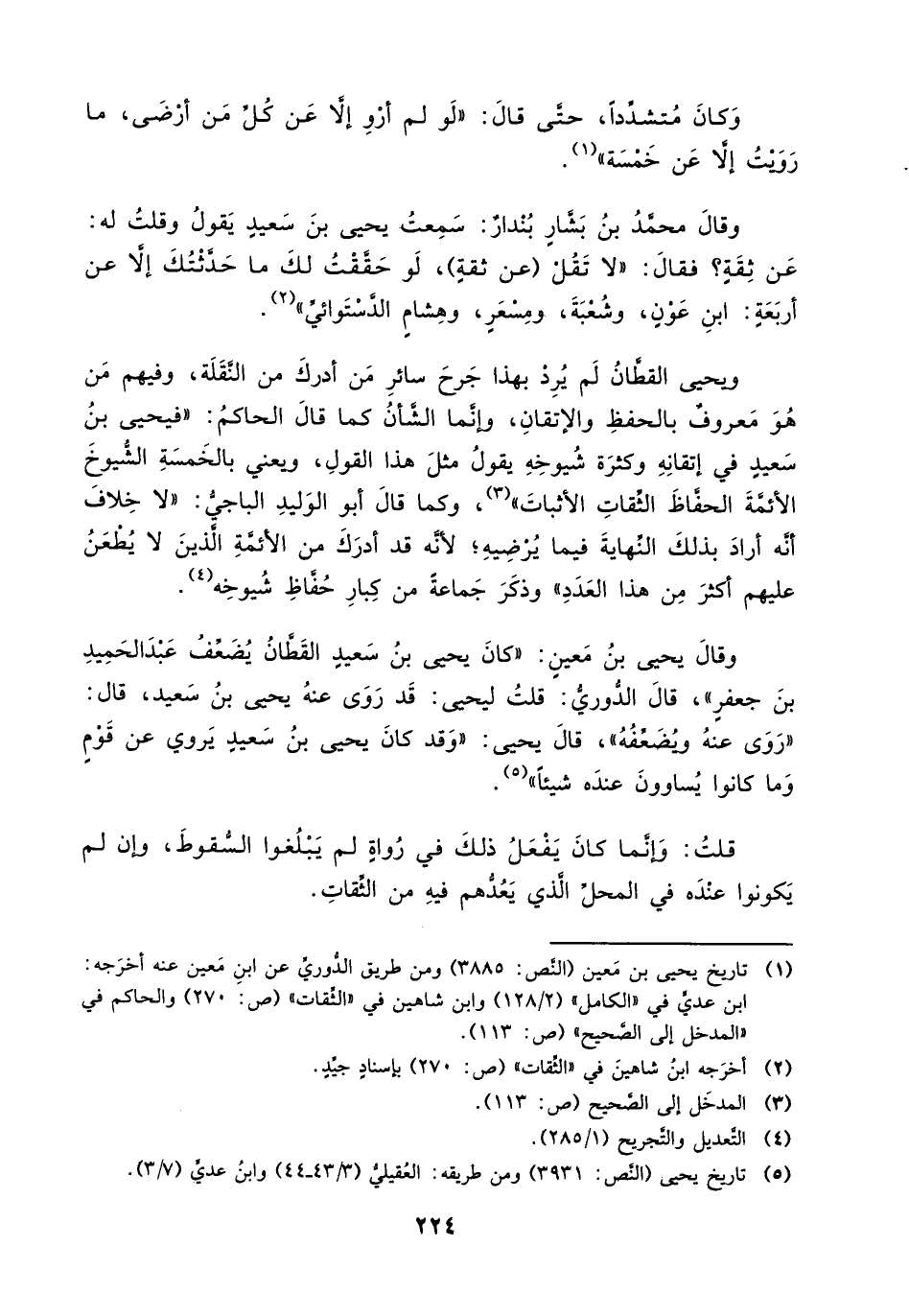 ويحيى القطان لم يرد بهذا جرح سائر من أدرك من النقلة، وفيهم من هو معروف بالحفظ والإتقان، وإنما الشأن كما قال الحاكم: " فيحيى بن سعيد في إتقانه وكثرة شيوخه يقول مثل هذا القول، ويعني بالخمسة الشيوخ الأئمة الحفاظ الثقات الأثبات " (¬3)، وكما قال أبو الوليد الباجي: " لاخلاف أنه أراد بذلك النهاية فيما يرضيه؛ لأنه قد أدرك من الأئمة الذين لا يطعن عليهم أكثر من هذا العدد " وذكر جماعة من كبار حفاظ شيوخه (¬4).