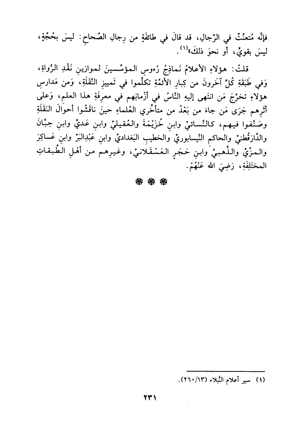 قلت هؤلاء الأعلام نماذج رءوس المؤسسين لموازين نقد الرواة، وفي طبقة كل آخرون من كبار الأئمة تكلموا في تمييز النقلة، ومن مدارس هؤلاء تخرج من انتهى إليه الناس في أزمانهم في معرفة هذا العلم، وعلى أثرهم جرى من جاء من بعد من متأخري العلماء حين ناقشوا أحوال النقلة وصنفوا فيهم، كالنسائي وابن خزيمة والعقيلي وابن عدي وابن حبان والدارقطني والحاكم النيسابوري والخطيب البغدادي وابن عبد البر وابن عساكر والمزي والذهبي وابن حجر العسقلاني، وغيرهم من أهل الطبقات المختلفة، رضي الله عنهم.