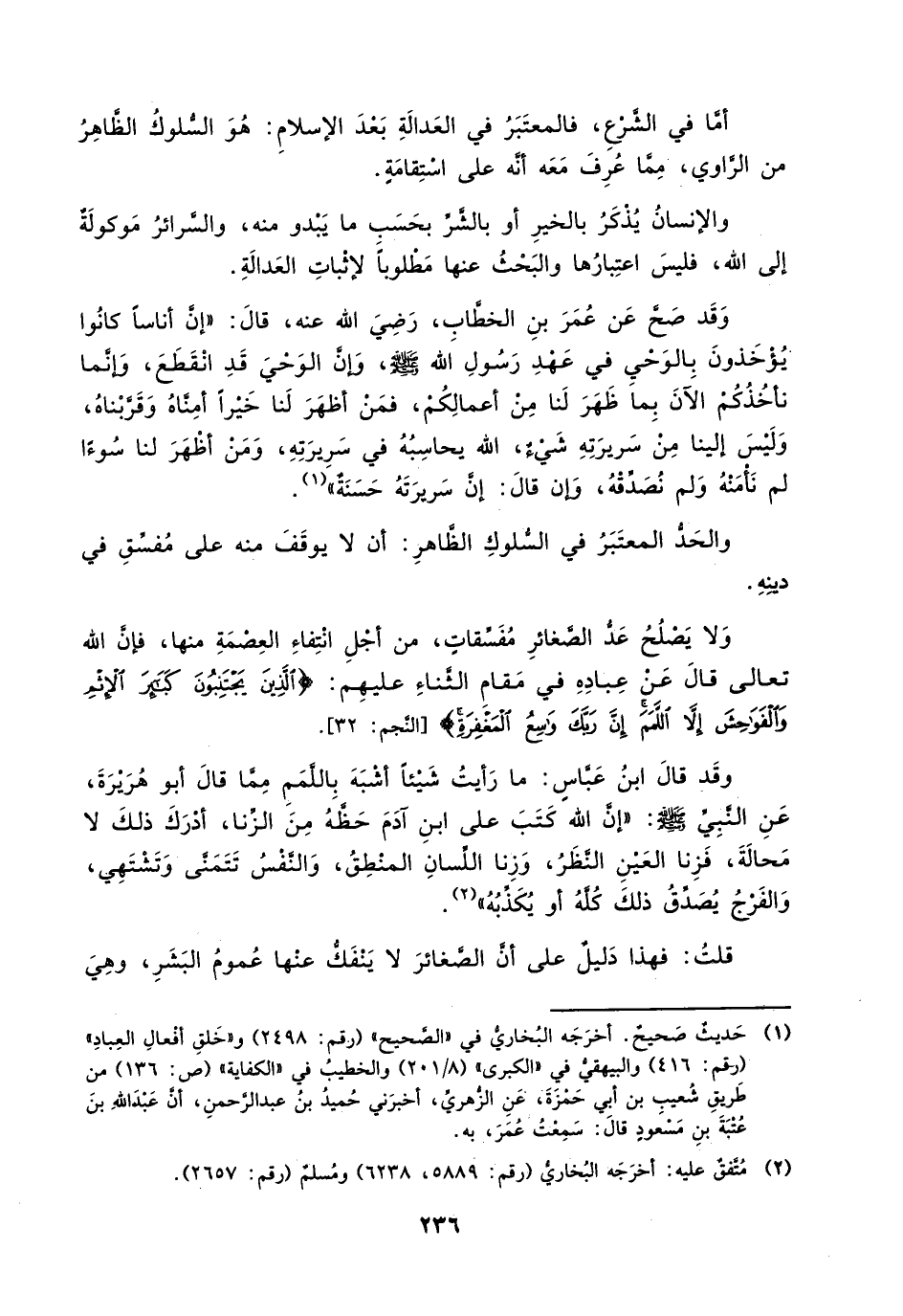 ولا يصلح عد الصغائر مفسقات، من أجل انتفاء العصمة منها، فإن الله تعالى قال عن عباده في مقام الثناء عليهم: {الَّذِينَ يَجْتَنِبُونَ كَبَائِرَ الإِثْمِ وَالْفَوَاحِشَ إِلاَّ اللَّمَمَ إِنَّ رَبَّكَ وَاسِعُ الْمَغْفِرَةِ} [النجم: 32].