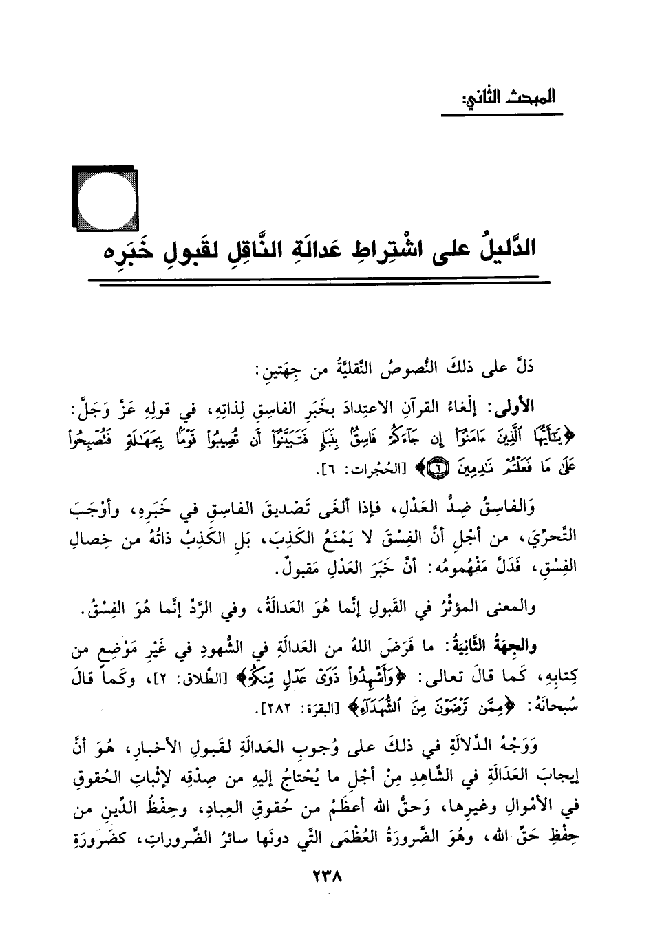 ووجه الدلالة في ذلك على وجوب العدالة لقبول الأخبار، هو أن إيجاب العدالة في الشاهد من أجل ما يحتاج إليه من صدقه لإثبات الحقوق في الأموال وغيرها، وحق الله أعظم من حقوق العباد، وحفظ الدين من حفظ حق الله، وهو الضرورة العظمى التي دونها سائر الضرورات، كضرورة