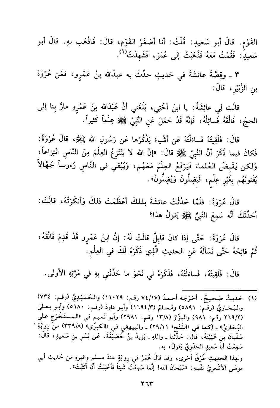 قال: فلقيته فساءلته عن أشياء يذكرها عن رسول الله صلى الله عليه وسلم، قال عروة: فكان فيما ذكر أن النبي صلى الله عليه وسلم قال: " إن الله لا ينتزع العلم من الناس انتزاعاً، ولكن يقبض العلماء فيرفع العلم معهم، ويبقي في الناس رءوسا ًجهالاً يفتونهم بغير علم، فيضلون ويضلون ".