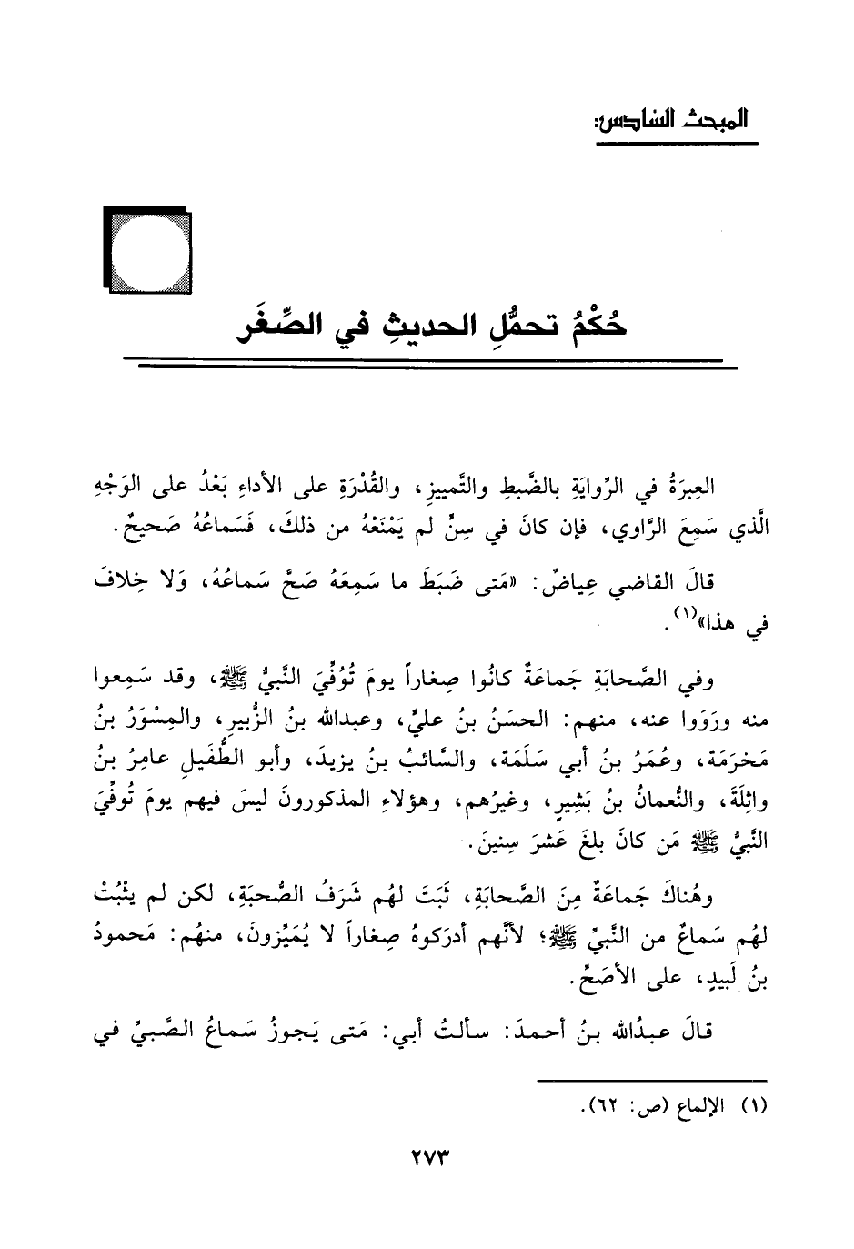 العبرة في الرواية بالضبط والتمييز، والقدرة على الأداء بعد على الوجه الذي سمع الراوي، فإن كان في سن لم يمنعه من ذلك، فسماعه صحيح.