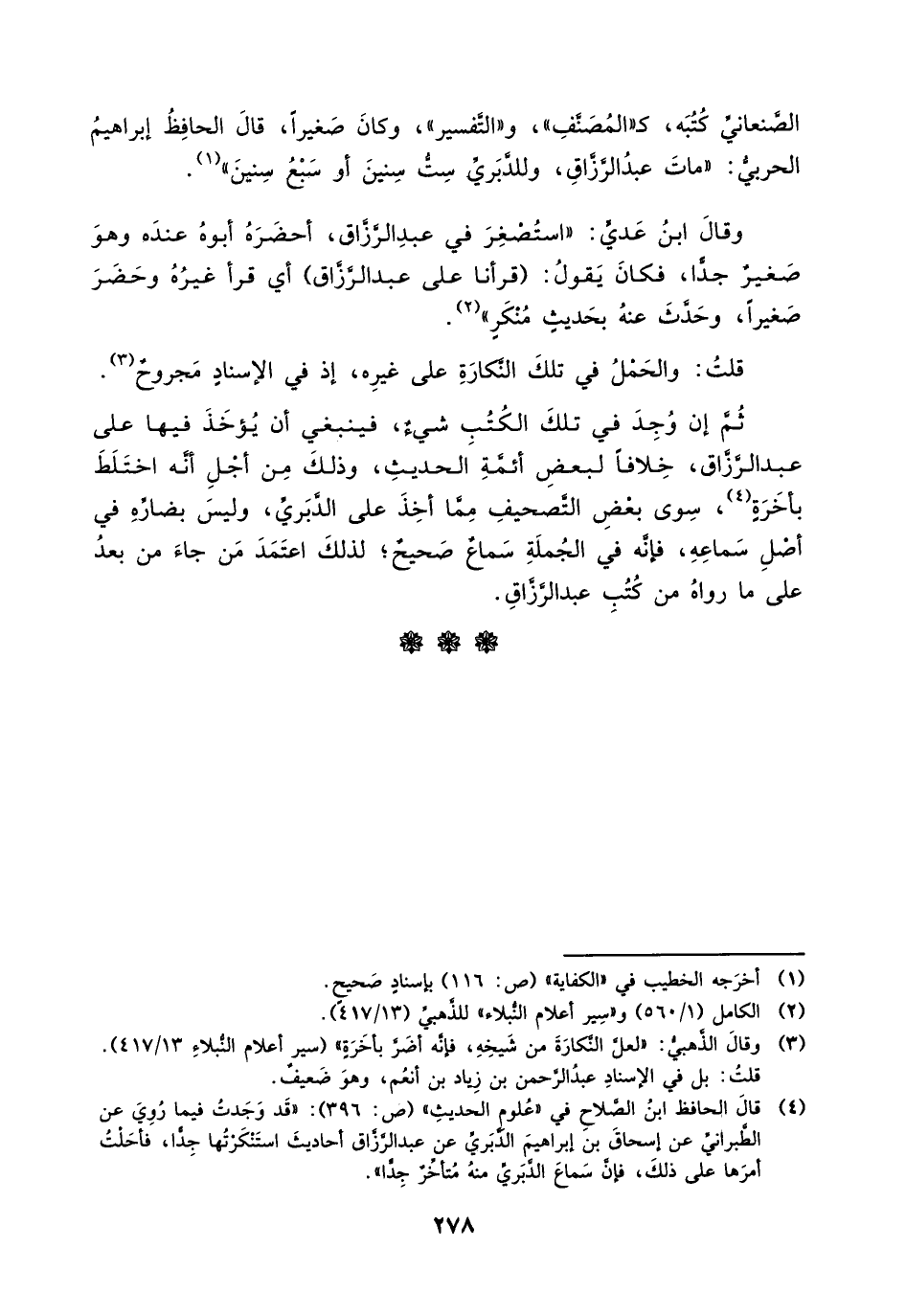 (¬4) قال الحافظ ابن الصلاح في " علوم الحديث " (ص: 396): " قد وَجدت فيما رُوي عن الطبراني عن إسحاق بن إبراهيم الدبري عن عبد الرزاق أحاديث استنكرها جِداً، فأحلْتُ أمرها على ذلك، فإن سماع الدبري منه مُتأخرٌ جِداً ".