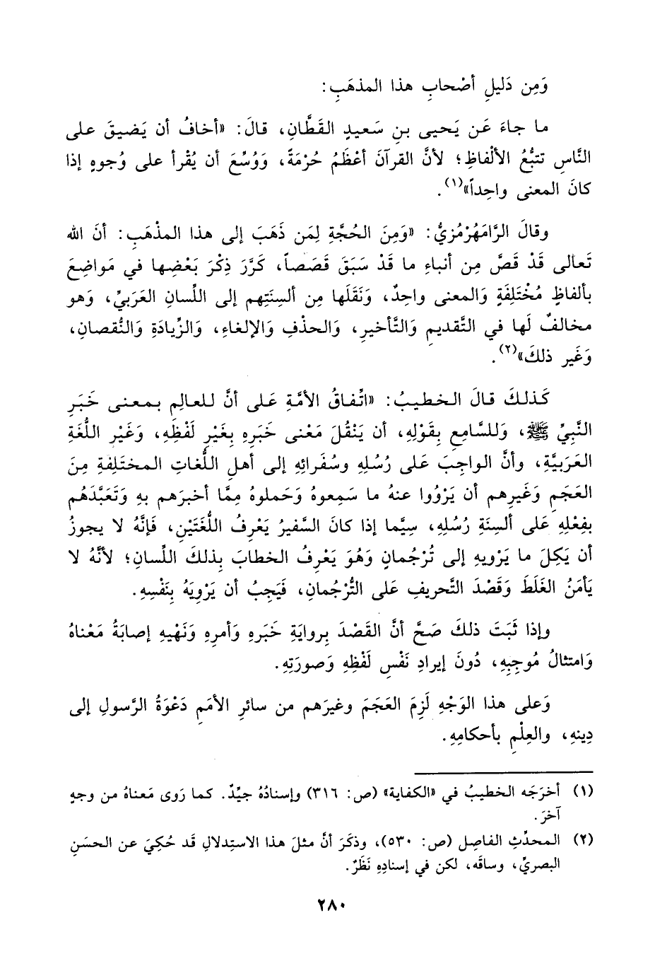كذلك قال الخطيب: " اتفاق الأمة على أن للعالم بمعنى خبر النبي صلى الله عليه وسلم، وللسامع بقوله، أن ينقل معنى خبره بغير لفظه، وغير اللغة العربية، وأن الواجب على رسله وسفرائه إلى أهل اللغات المختلفة من العجم وغيرهم أن يرووا عنه ما سمعوه وحملوه مما أخبرهم به وتعبدهم بفعله على ألسنة رسله، سيِّما إذا كانوا السفير يعرف اللغتين، فإنه لا يجوز أن يكل ما يرويه إلى ترجمان وهو يعرف الخطاب بذلك اللسان؛ لأنه لا يأمن الغلط وقصد التحريف على الترجمان، فيجب أن يرويه بنفسه.