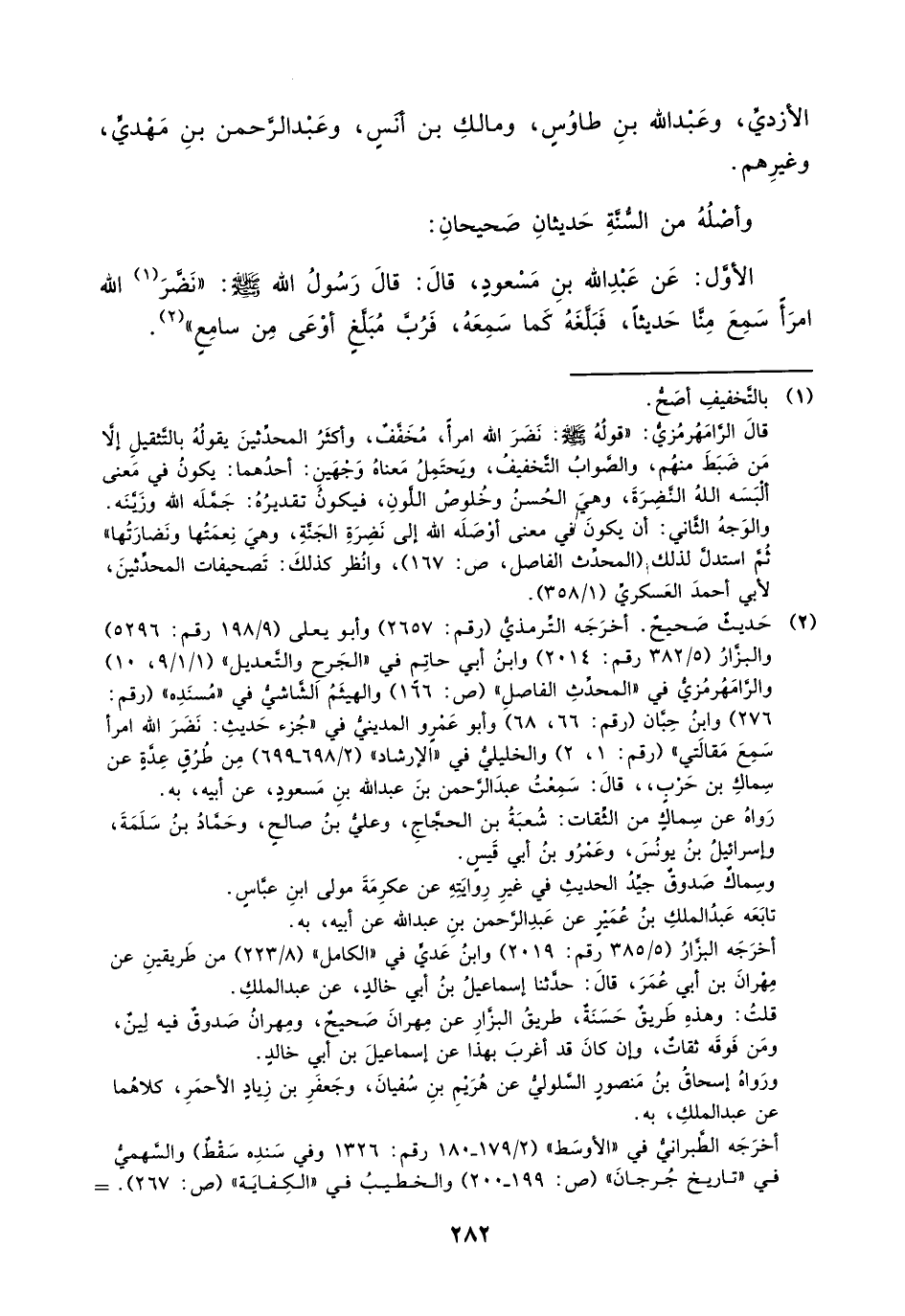 (¬2) حديث صحيح. أخرجه الترمذي (رقم: 2657) وأبو يعلى (9/ 198 رقم: 5296) والبزار (5/ 382 رقم: 2014) وابن أبي حاتم في " الجرح والتعديل " (1/ 1 / 9، 10) والرامهرمزي في " المحدث الفاصل " (ص: 166) والهيثم الشاشي في " مسنده " (رقم: 276) وابن حبان (رقم: 66، 68) وأبو عمرو المديني في " جزء حديث: نضَر الله امرأ سمع مقالتي " (رقم: 1، 2) والخليلي في " الإرشاد " (2/ 698 _ 699) من طُرق عِدة عن سِماك بن حربٍ، قال: سمعت عبدَ الرحمن بن عبد الله بن مسعود، عن أبيه، به. رواه عن سماك من الثقات: شُعبة بن الحجاج، وعلي بن صالح، وحماد بن سلمة، وإسرائيل بن يونس، وعمرْو بن أبي قيس.