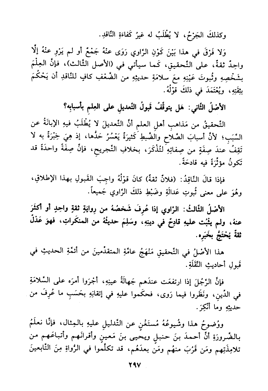 ولا فرق في هذا بين كون الراوي روى عنه جمع أو لم يرو عنه إلا واحد ثقة، على التحقيق، كما سيأتي في (الأصل الثالث)، فإن العلم بشخصه وثبوت عينه مع سلامة حديثه من الضعف كاف للناقد أن يحكم بثقته، ويعتمد في ذلك قوله.