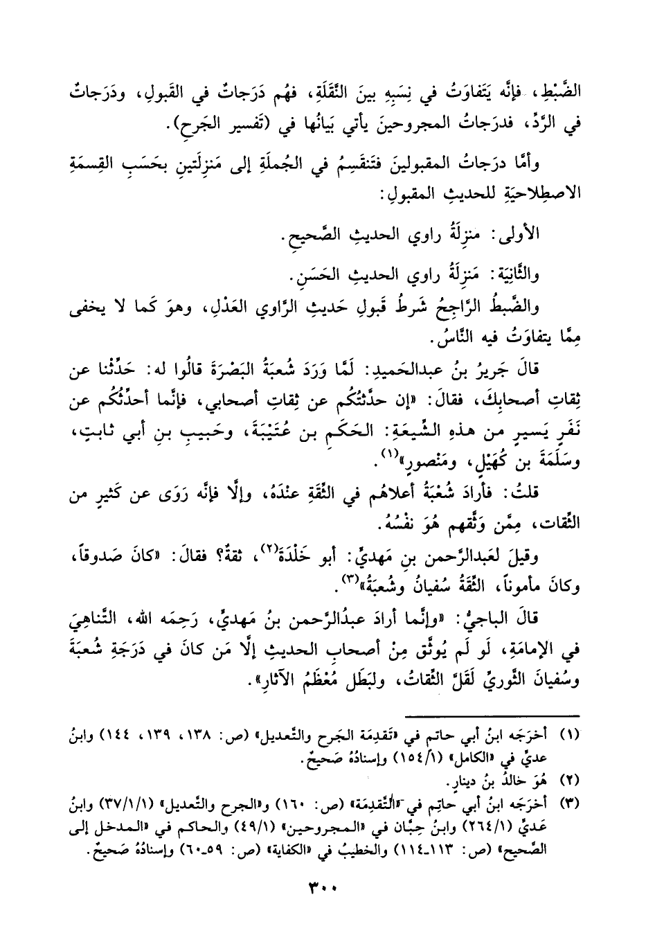 قال الباجي: " وإنما أراد عبد الرحمن بن مهدي، رحمه الله، التناهي في الإمامة، لو لم يوثق من أصحاب الحديث إلا من كان في درجة شعبة وسفيان الثوري لقل الثقات، ولبطل معظم الآثار ".