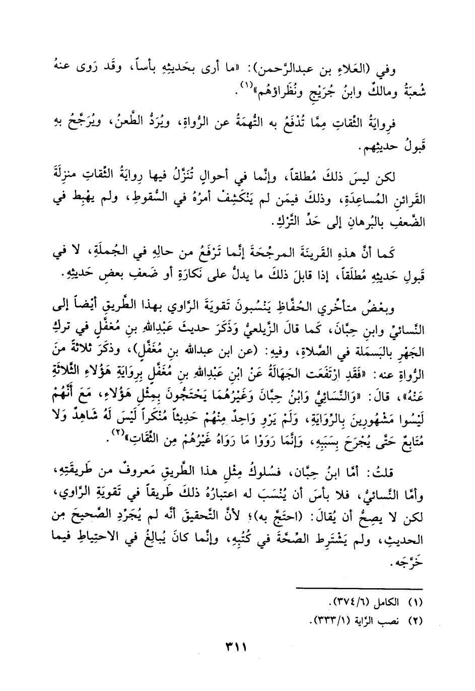 وبعض متأخري الحفاظ ينسبون تقوية الراوي بهذا الطريق أيضاً إلى النسائي وابن حبان، كما قال الزيلعي وذكر حديث عبد الله بن مغفل في ترك الجهر بالبسملة في الصلاة، وفيه: (عن ابن عبد الله بن مغفل)، وذكر ثلاثة من الرواة عنه: " فقد ارتفعت الجهالة عن ابن عبد الله بن مغفل برواية هؤلاء الثلاثة عنه "، قال: " والنسائي وابن حبان وغيرهما يحتجون بمثل هؤلاء، مع أنهم ليسوا مشهورين بالرواية، ولم يرو واحد منهم حديثا ً منكراً ليس له شاهد ولا متابع حتى يجرح بسببه، وإنما رووا غيرهم من الثقات " (¬2).
