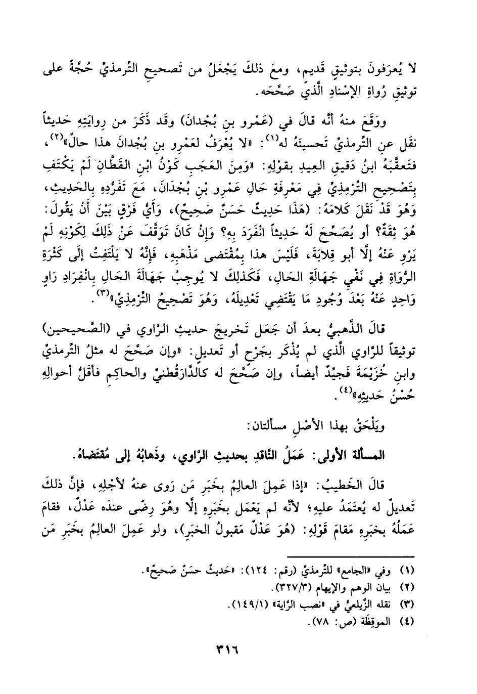 ووقع منه أنه قال في (عمرو بن بجدان) وقد ذكر من روايته حديثاً نقل عن الترمذي تحسينه له (¬1): " لا يعرف لعمرو بن بجدان هذا حال " (¬2)، فتعقبه ابن دقيق العيد بقوله: " ومن العجب كون ابن قطان لم يكتف بتصحيح الترمذي في معرفة حال عمرو بن بجدان، مع تفرده بالحديث، وهو قد نقل كلامه: (هذا حديث حسن صحيح)، وأي فرق بين أن يقول: هو ثقة؟ أو يصحح له حديثاً انفرد به؟ وإن كان توقف عن ذلك لكونه لم يرو عنه إلا أبو قلابة، فليس هذا بمقتضى مذهبه، فإنه لا يلتفت إلى كثرة الرواة في نفي جهالة الحال، فكذلك لا يوجب جهالة الحال بانفراد راو واحد عنه بعد وجود ما يقتضي تعديله , وهو تصحيح الترمذي " (¬3).