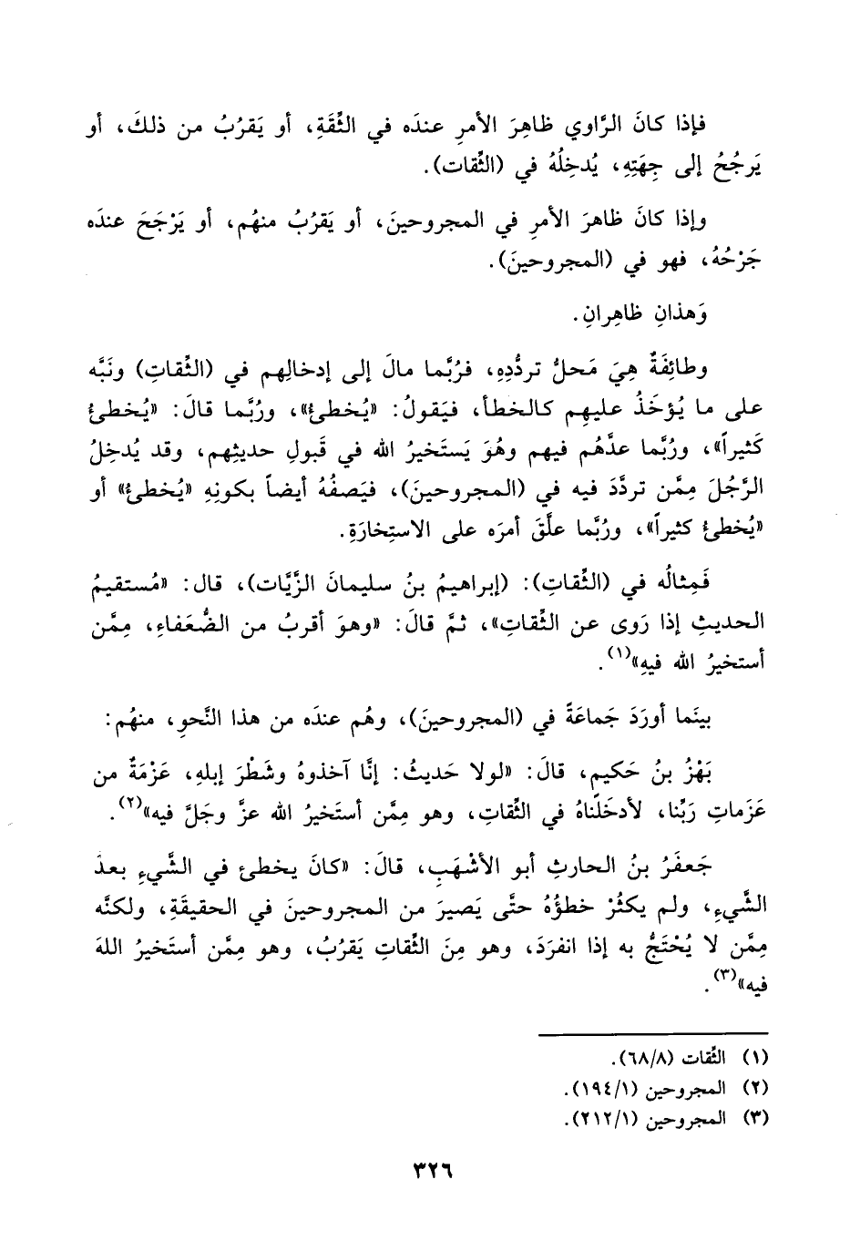 وطائفة هي محل تردده، فربما مال إلى إدخالهم في (الثقات) ونبه على ما يؤخذ عليهم كالخطأ، فيقول: " يخطئ "، وربما قال: " يخطئ كثيراً "، وربما عدهم فيهم وهو يستخير الله في قبول حديثهم، وقد يدخل الرجل ممن تردد فيه في (المجروحين)، فيصفه أيضاً بكونه " يخطئ " أو " يخطئ كثيراً "، وربما علق أمره على الاستخارة.
