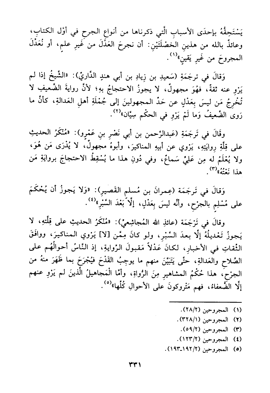 يستحقه بإحدى الأسباب التي ذكرناها من أنواع الجرح في أول الكتاب، وعائذ بالله من هذين الخصلتين: أن نجرح العدل من غير علم، أو نعدل المجروح من غير يقين " (¬1).