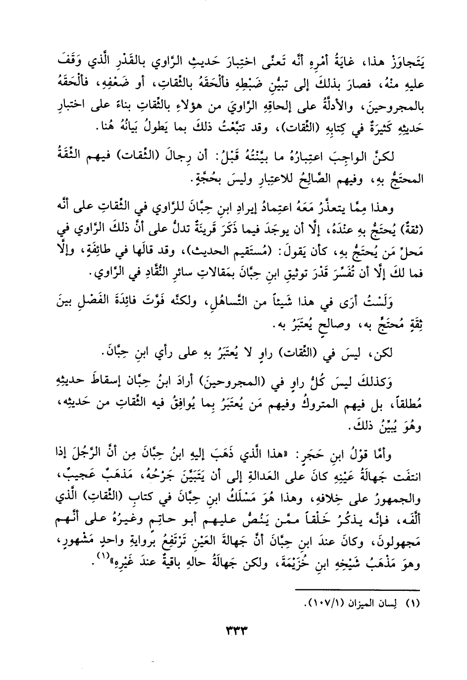 يتجاوز هذا، غاية أمره أنه تعنى اختبار حديث الراوي بالقدر الذي وقف عليه منه، فصار بذلك إلى تبين ضبطه فألحقه بالثقات، أو ضعفه، فألحقه بالمجروحين، والأدلة على إلحاقه الراوي من هؤلاء بالثقات بناء على اختبار حديثه كثيرة في كتابه (الثقات)، وقد تتبعت ذلك بما يطول بيانه هنا.