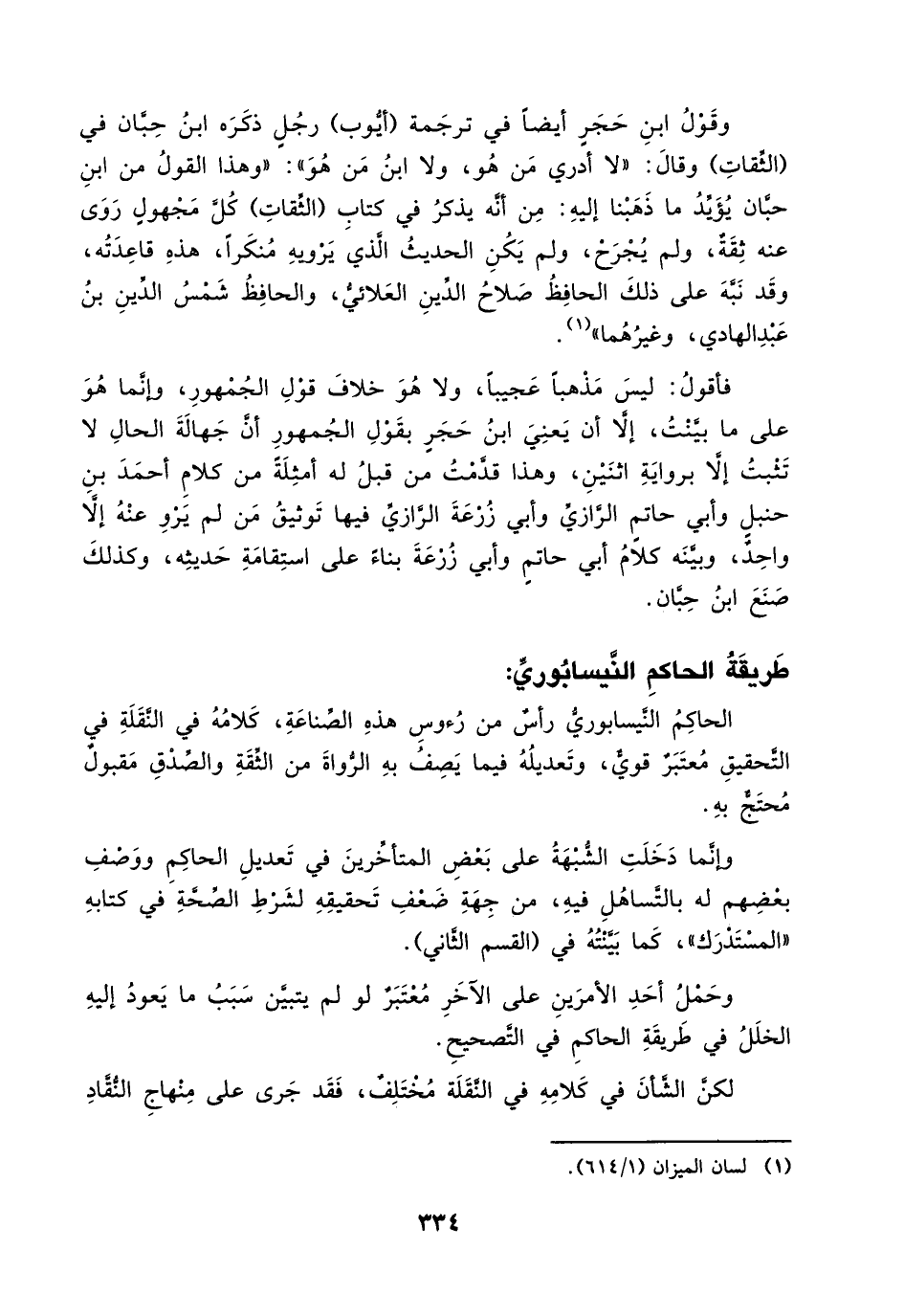 وقول ابن حجر أيضاً في ترجمة (أيوب) رجل ذكره ابن حبان في (الثقات) وقال: " لا أدري من هو، ولا ابن من هو ": " وهذا القول من ابن حبان يؤيد ما ذهبنا إليه: من أنه يذكر في كتاب (الثقات) كل مجهول روى عنه ثقة، ولم يجرح، ولم يكن الحديث الذي يرويه منكراً، هذه قاعدته، وقد نبه على ذلك الحافظ صلاح الدين العلائي، والحافظ شمس الدين بن عبد الهادي، وغيرهما " (¬1).