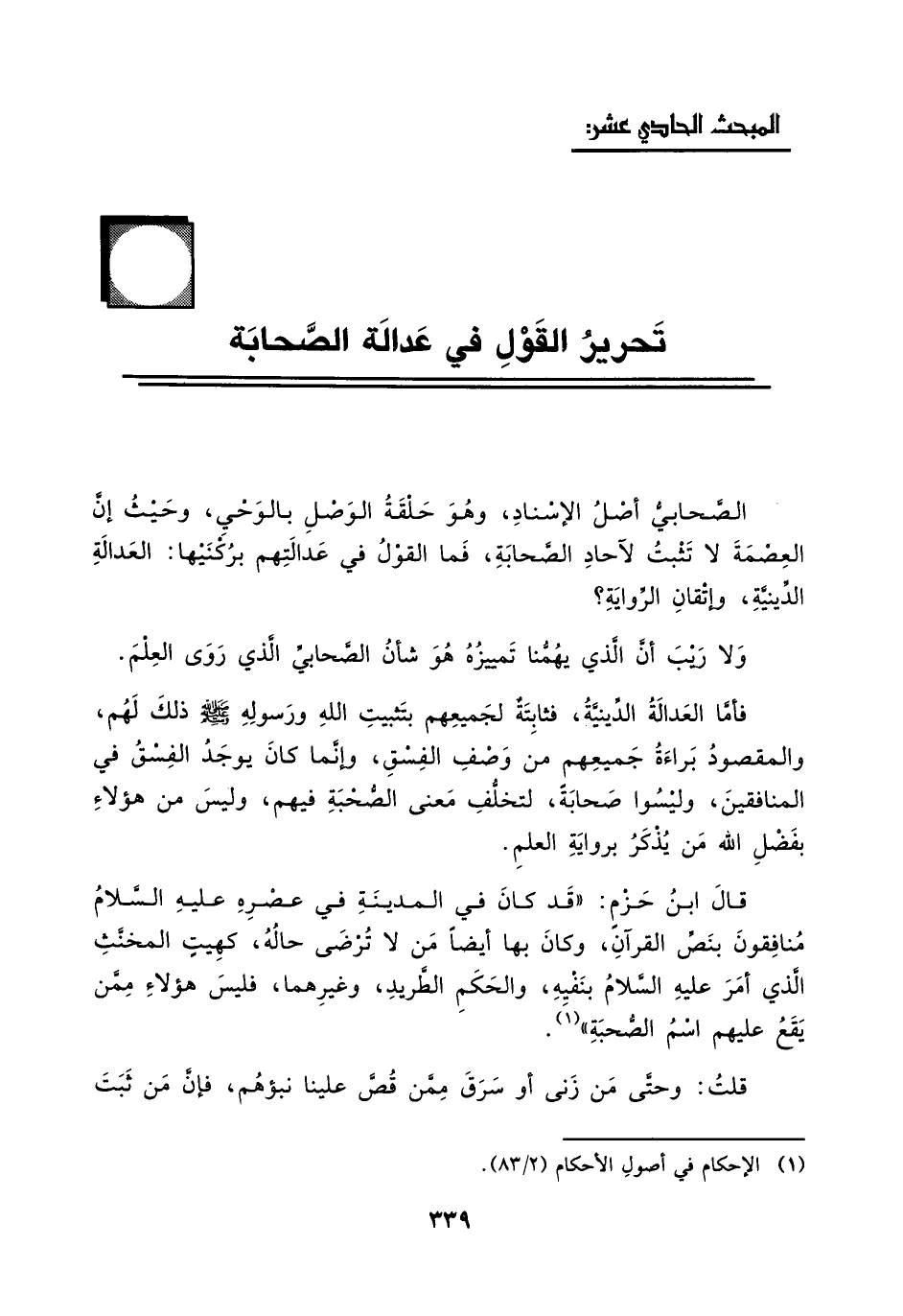 الصحابي أصل الإسناد، وهو حلقة الوصل بالوحي، وحيث إن العصمة لا تثبت لآحاد الصحابة، فما القول في عدالتهم بركنيها: العدالة الدينية، وإتقان الرواية؟