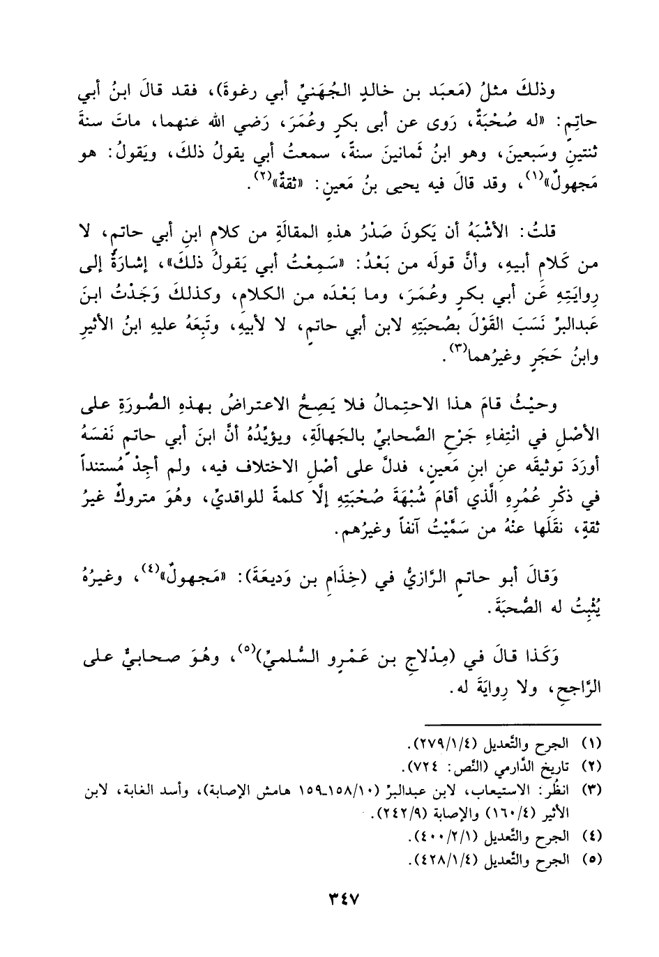 قلت: الأشبه أن يكون صدر هذه المقالة من كلام ابن أبي حاتم، لا من كلام أبيه، وأن قوله من بعد: " سمعت أبي يقول ذلك "، إشارة إلى روايته عن أبي بكر وعمر، وما بعده من الكلام، وكذلك وجدت ابن عبد البر نسب القول بصحبته لا بن أبي حاتم، لا لأبيه، وتبعه عليه ابن الأثير وابن حجر وغيرهما (¬3).