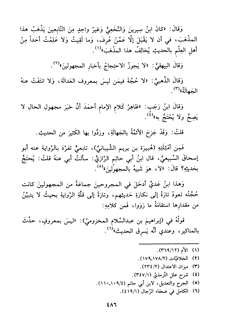 وقال الذهبي: " لا حجة فيمن ليس بمعروف العدالة، ولا انتفت عنه الجهالة " (¬3).