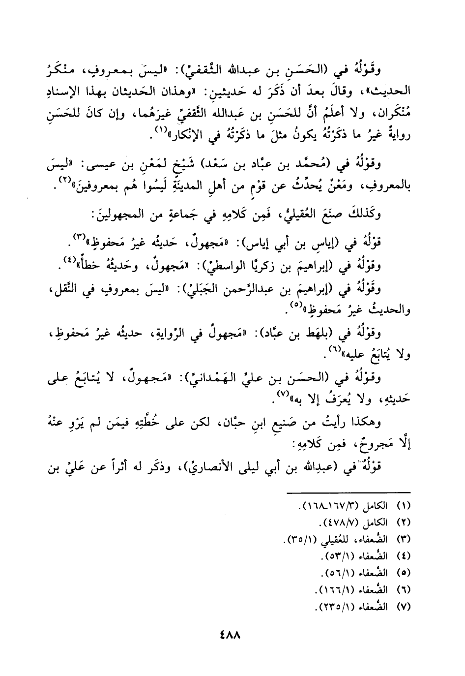 وقوله في (الحسن بن عبد الله الثقفي): " ليس بمعروف، منكر الحديث "، وقال بعد أن ذكر له حديثين: " وهذان الحديثان بهذا الإسناد منكران، ولا أعلم أنّ للحسن بن عبد الله الثقفي غيرهما، وإن كان للحسن رواية غير ما ذكرته يكون مثل ما ذكرته في الإنكار " (¬1).