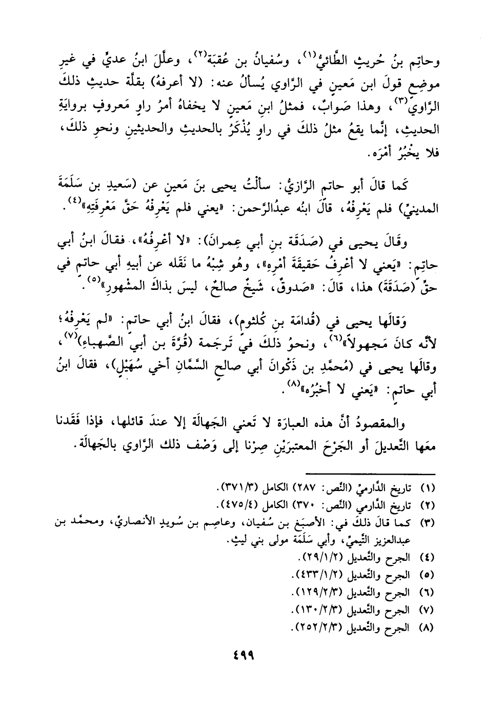 كما قال أبو حاتم الرازي: سألت يحيى بن معين عن (سعيد بن سلمة المديني) فلم يعرفه، قال ابنه عبد الرحمن: " يعني فلم يعرفه حق معرفته " (¬4).