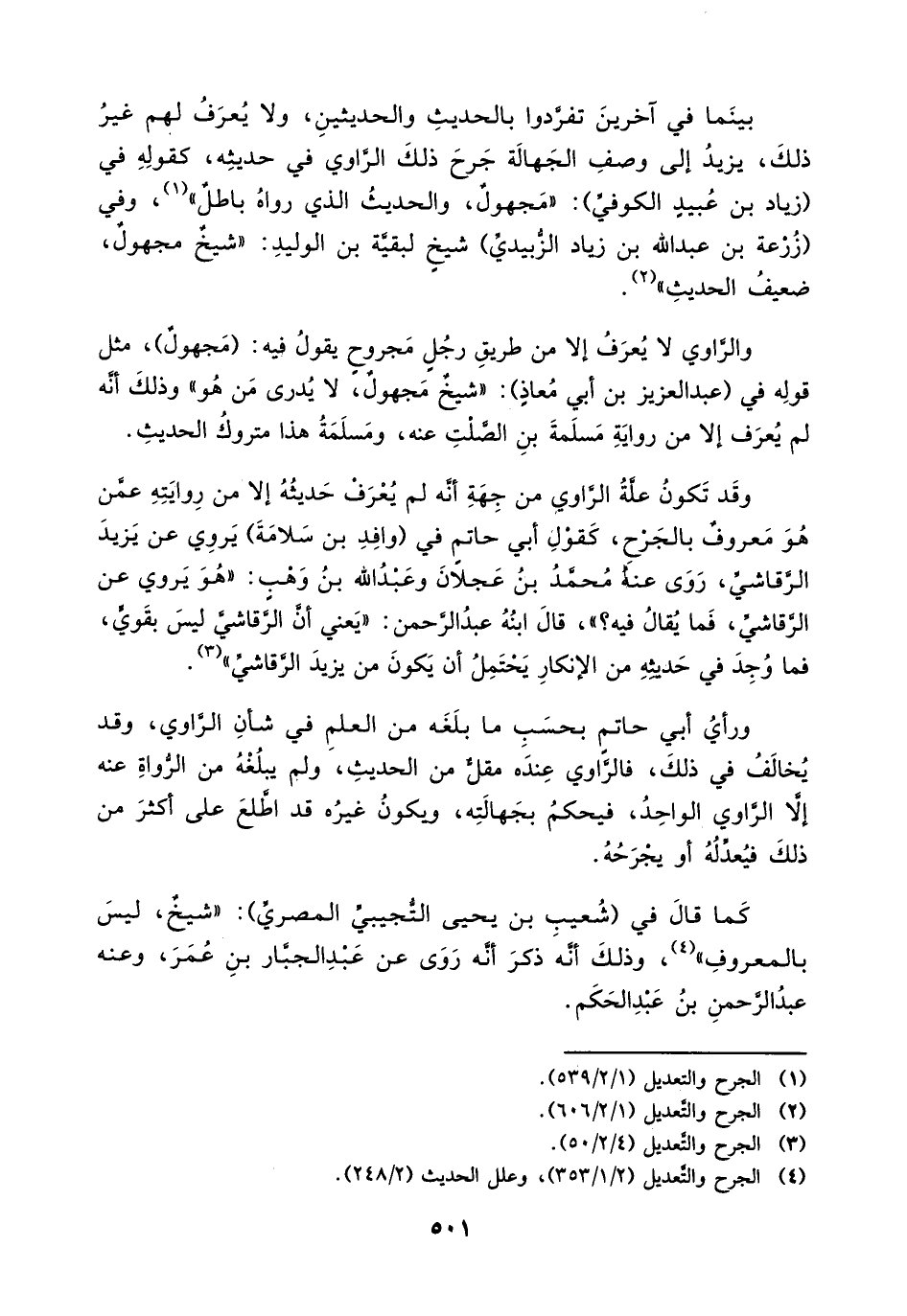 بينما في آخرين تفردوا بالحديث والحديثين، ولا يعرف لهم غير ذلك، يزيد إلى وصف الجهالة جرح ذلك الراوي في حديثه، كقوله في (زياد بن عبيد الكوفي): " مجهول، والحديث الذي رواه باطل " (¬1)، وفي (زرعة بن عبد الله بن زياد الزبيدي) شيخ لبقية بن الوليد: " شيخ مجهول، ضعيف الحديث " (¬2).