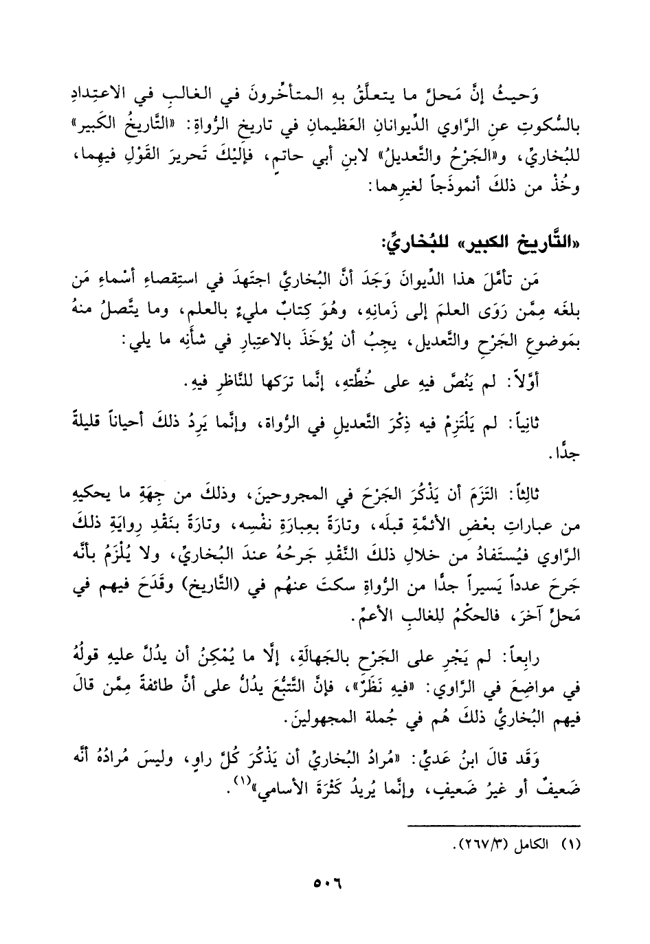 وحيث إن محل ما يتعلق به المتأخرون في الغالب في الاعتداد بالسكوت عن الراوي الديوانان العظيمان في تاريخ الرواة: " التاريخ الكبير " للبخاري، و " الجرح والتعديل " لا بن أبي حاتم، فإليك تحرير القول فيهما، وخذ من ذلك أنموذجاً لغيرهما: