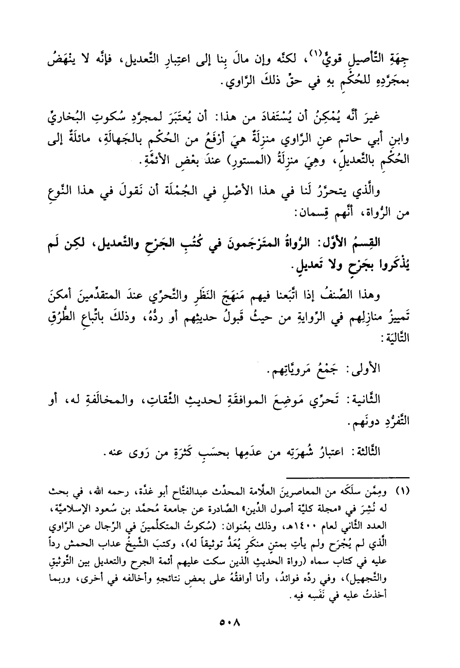 (¬1) وممن سلكه من المعاصرين العلامة المحدث عبد الفتاح أبو غدة، رحمه الله، في بحث له نُشر في " مجلة كليَّة أصول الدين " الصادرة عن جامعة محمد بن سعود الإسلامية، العدد الثاني لعام 1400 هـ، وذلك بعنوان: (سُكوت المتكلمين في الرجال عن الراوي الذي لم يُجرح ولم يأتِ بمتنٍ منكر يُعدُّ توثيقاً له)، وكتب الشيخ عداب الحمش رداَّ عليه في كتاب سماه (رواة الحديث الذي سكت عليهم أئمة الجرح والتعديل بين التوثيق والتجهيل)، وفي ردِّه فوائد، وأنا أوافقه على بعض نتائجه وأخالفه في أخرى، وربما أخذت عليه في نفسه فيه.