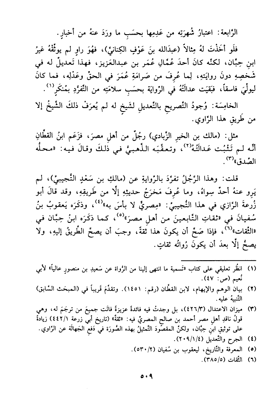 (¬3) ميزان الاعتدال (3/ 426)، بل وجدت فيه فائدة عزيزة فاتت جميع من ترجم له، وهي قولُ ناقد أهل مصر أحمد بن صالح المصري فيه: " ثقة " (تاريخ أبي زُرعة 1/ 442) زيادةً على توثيق ابنِ حبان، ولكن المقصود التمثيل بهذه الصورة في دَفع الجَهالة عن الراوي.