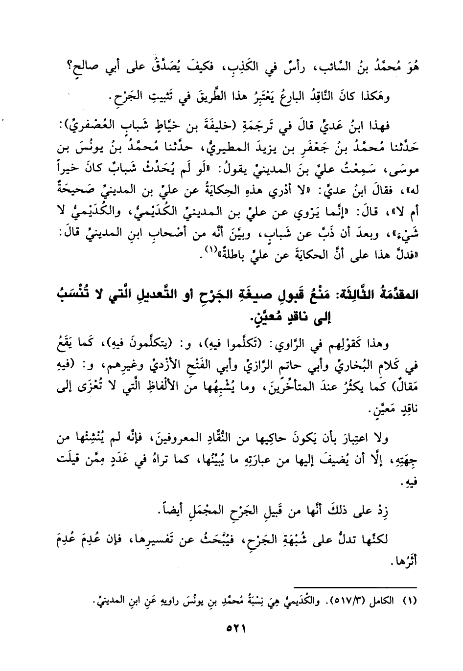 المقدمة الثالثة: منع قبول صيغة الجرح أو التعديل التي لا تنسب إلى ناقد معين