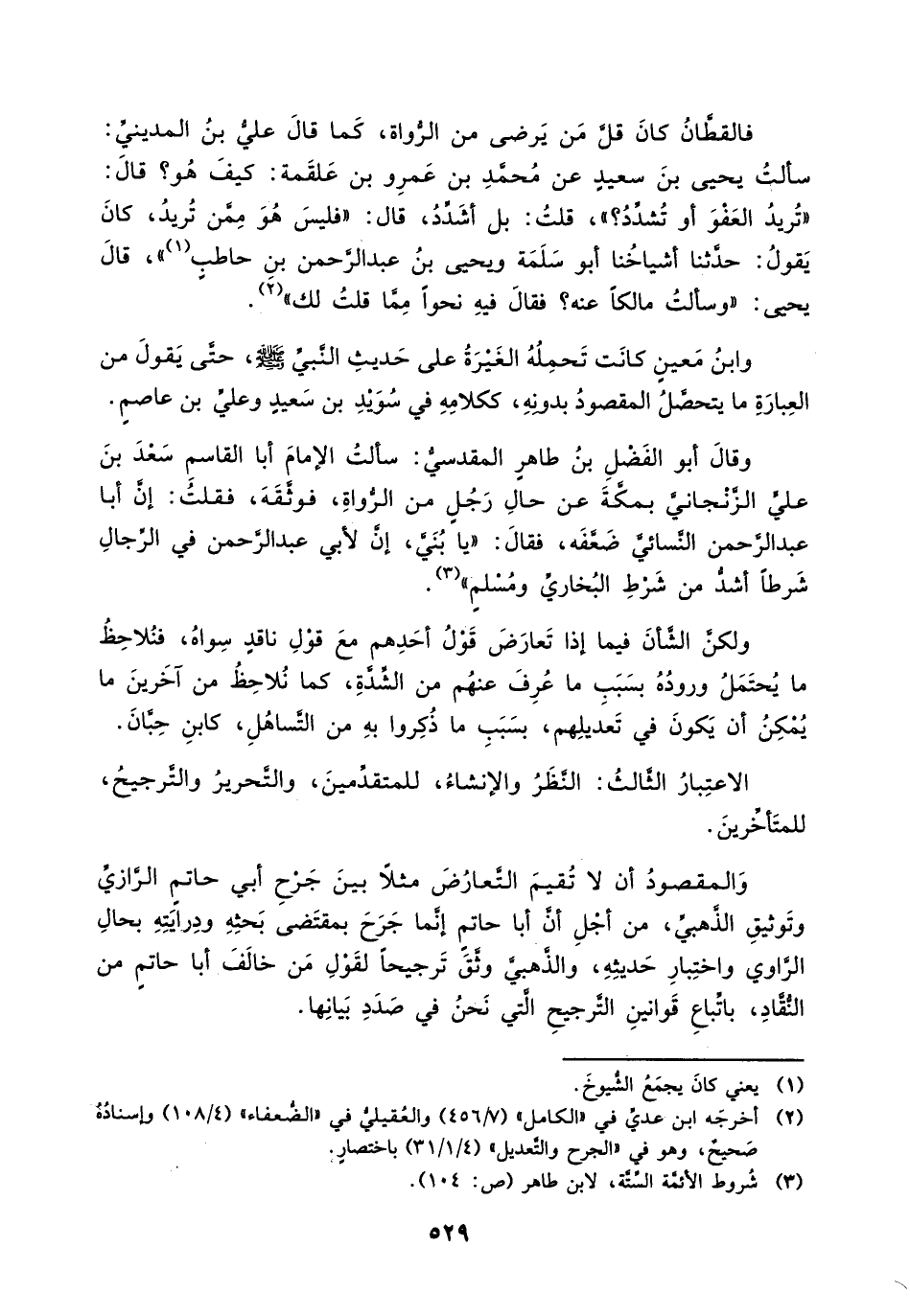 والمقصود أن لا تقيم التعارض مثلاً بين جرح أبي حاتم الرازي وتوثيق الذهبي، من أجل أن أبا حاتم إنما جرح بمقتضى بحثه ودرايته بحال الراوي واختبار حديثه، والذهبي وثق ترجيحاً لقول من خالف أبا حاتم من النقاد، باتباع قوانين الترجيح التي نحن في صدد بيانها.
