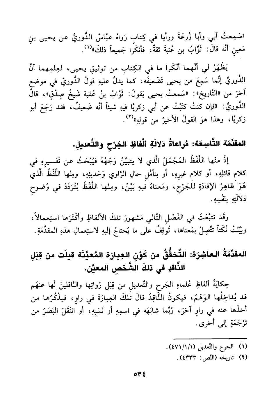 يظهر لي أنهما أنكرا ما في الكتاب من توثيق يحيى، لعلمهما أن الدوري إنما سمع من يحيى تضعيفه، كما يدل عليه قول الدوري في موضع آخر من " التاريخ ": " سمعت يحيى يقول: ثواب بن عقبة شيخ صدق "، قال الدوري: " فإن كنت كتبت عن أبي زكريا فيه شيئاً أنه ضعيف،، فقد رجع أبو زكريا، وهذا هو القول الأخير من قوله " (¬2).