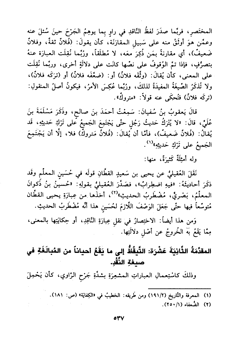 المختصر، فربما صدر لفظ الناقد في راو بما يوهم الجرح حين سئل عنه وعمن هو أوثق منه على سبيل المقارنة، كأن يقول: (فلان ثقة، وفلان ضعيف)، أي مقارنة بمن ذكر معه، لا مطلقاً، وربما نقلت العبارة عنه بتصرف، فإذا تم الوقوف على نصها كانت على دلالة أخرى، وربما نقلت على المعنى، كأن يقال: (وثقه فلان) أو: (ضعفه فلان) أو (تركه فلان)، ولا تذكر الصيغة المفيدة لذلك، وربما عكس الأمر، فيكون أصل المنقول: (تركه فلان) فتحكى عنه قولا: " متروك ".