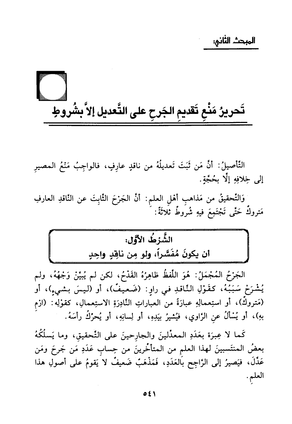 والتحقيق من مذاهب أهل العلم: أن الجرح الثابت عن الناقد العارف متروك حتى تجتمع فيه شروط ثلاثة: