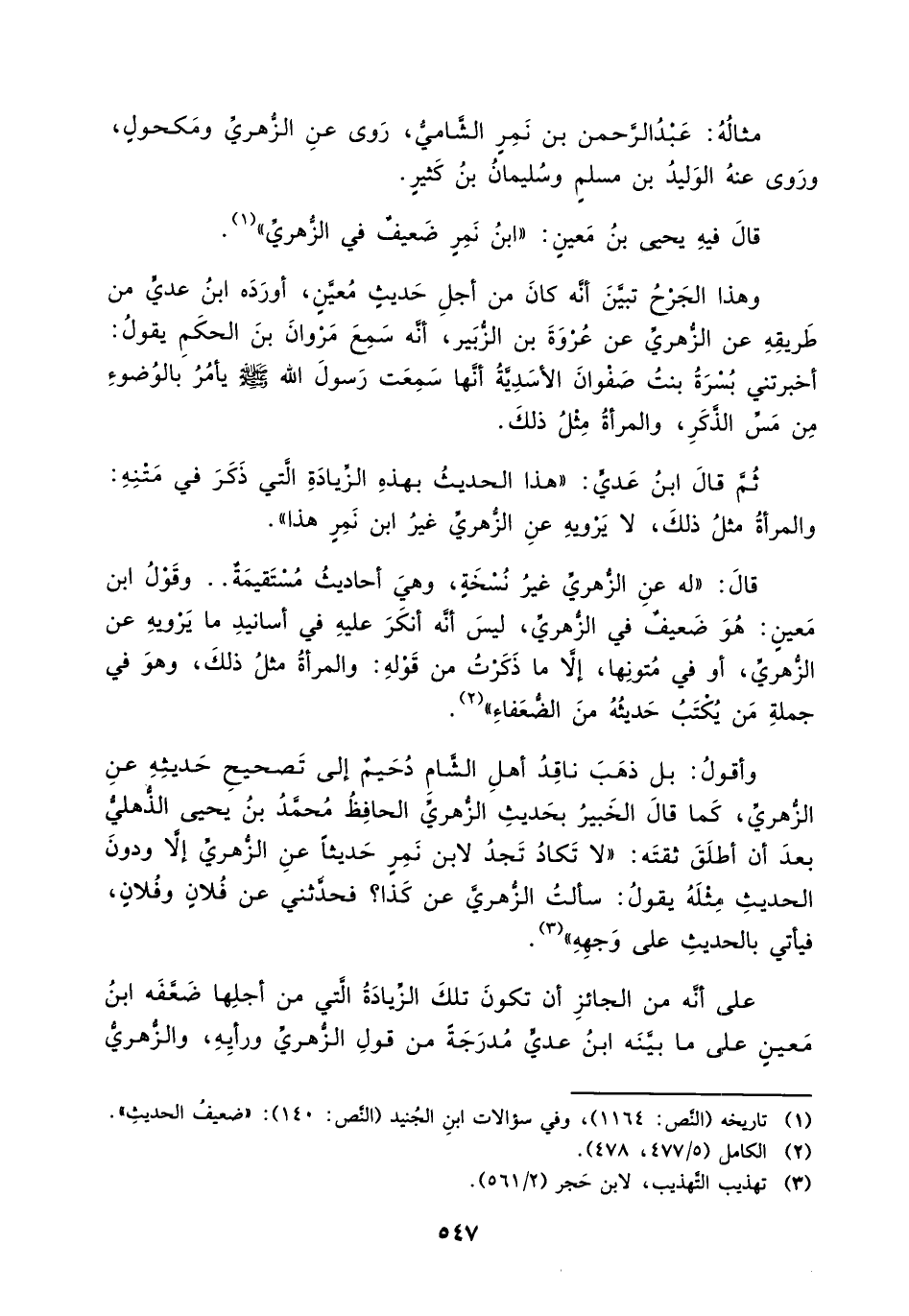 وأقول: بل ذهب ناقد أهل الشام دحيم إلى تصحيح حديثه عن الزهري، كما قال الخبير بحديث الزهري الحافظ محمد بن يحيى الذهلي بعد أن أطلق ثقته: " لا تكاد تجد لا بن نمر حديثاً عن الزهري إلا ودون الحديث مثله يقول: سألت الزهري عن كذا؟ فحدثني عن فلان وفلان، فيأتي بالحديث على وجهه " (¬3).