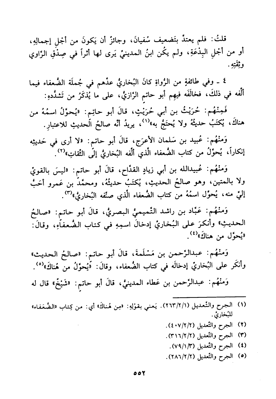 4 _ وفي طائفة من الرواة كان البخاري عدهم في جملة الضعفاء فيما ألفه في ذلك، فخالفه فيهم أبو حاتم الرازي، على ما يذكر من تشدده: